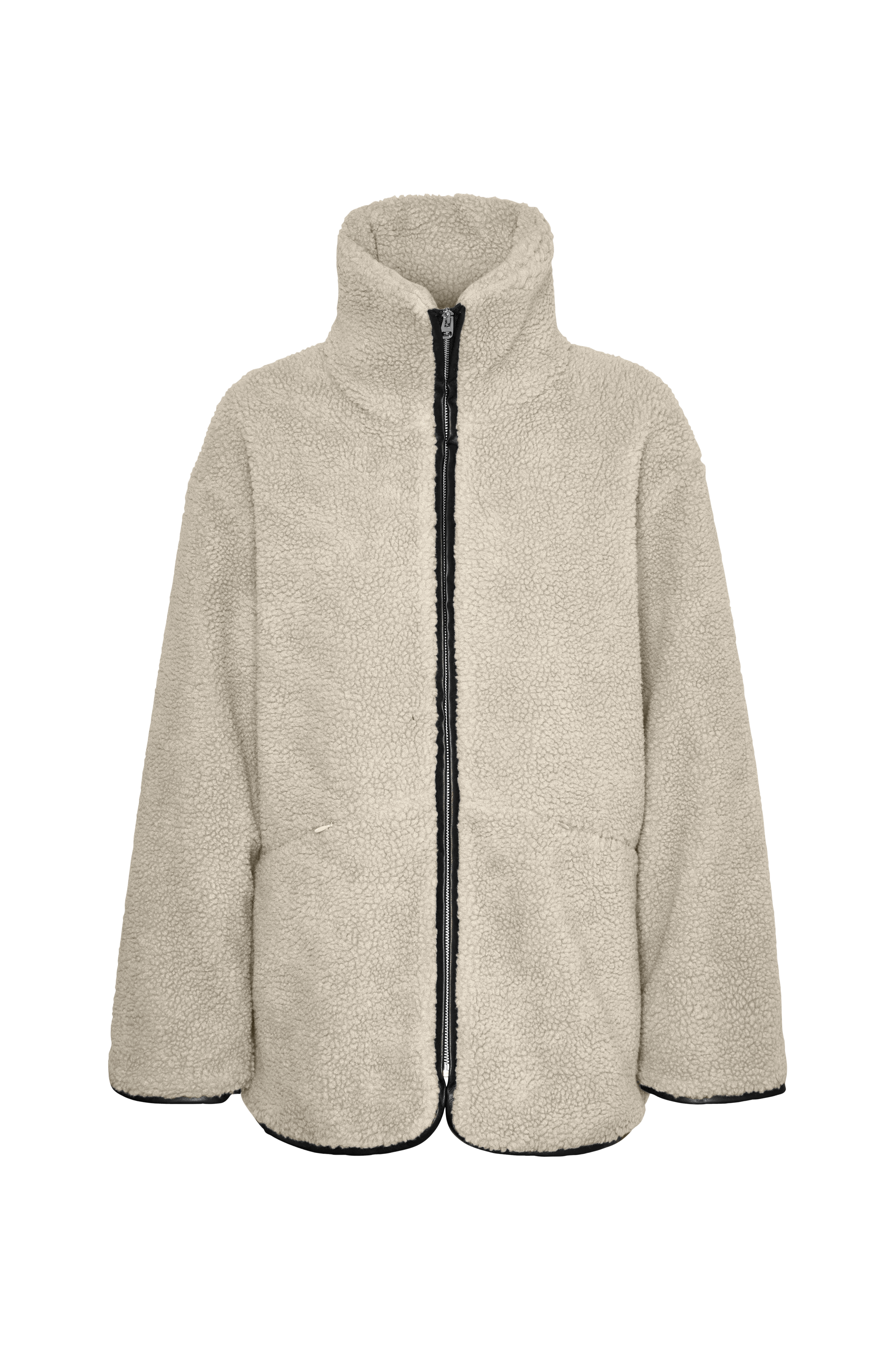 • Jacka i teddy • Vävt, slätt foder • Ståkrage • Dragkedja • Två fickor med dold dragkedja • Kanter i skinnimitation i ärmsluten och nedtill • Längd: 71 cm i storlek S