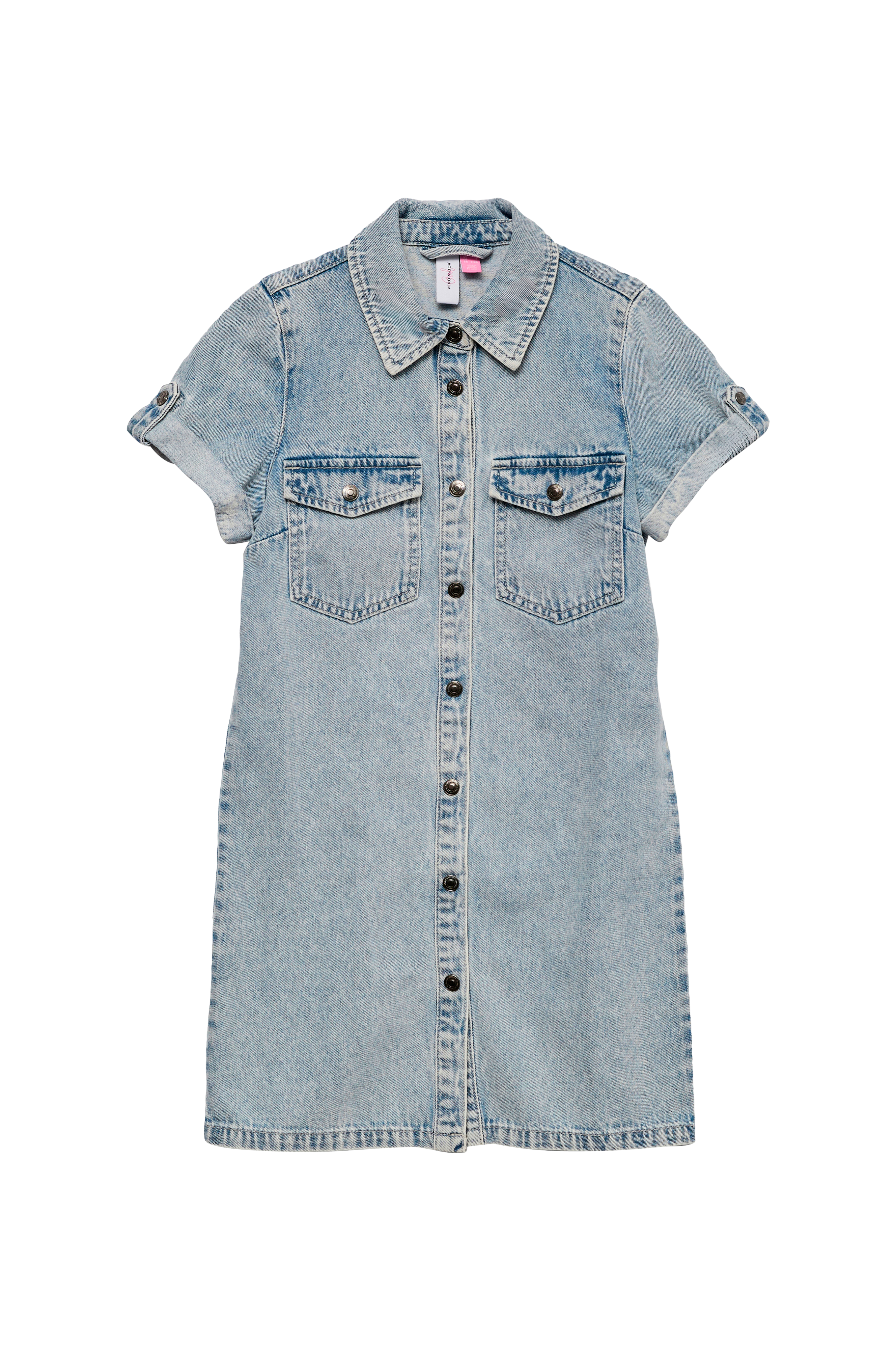 • Jeansklänning med krage• Korta, uppvikta ärmar med slejf• Tryckknappar• Bröstfickor med lock