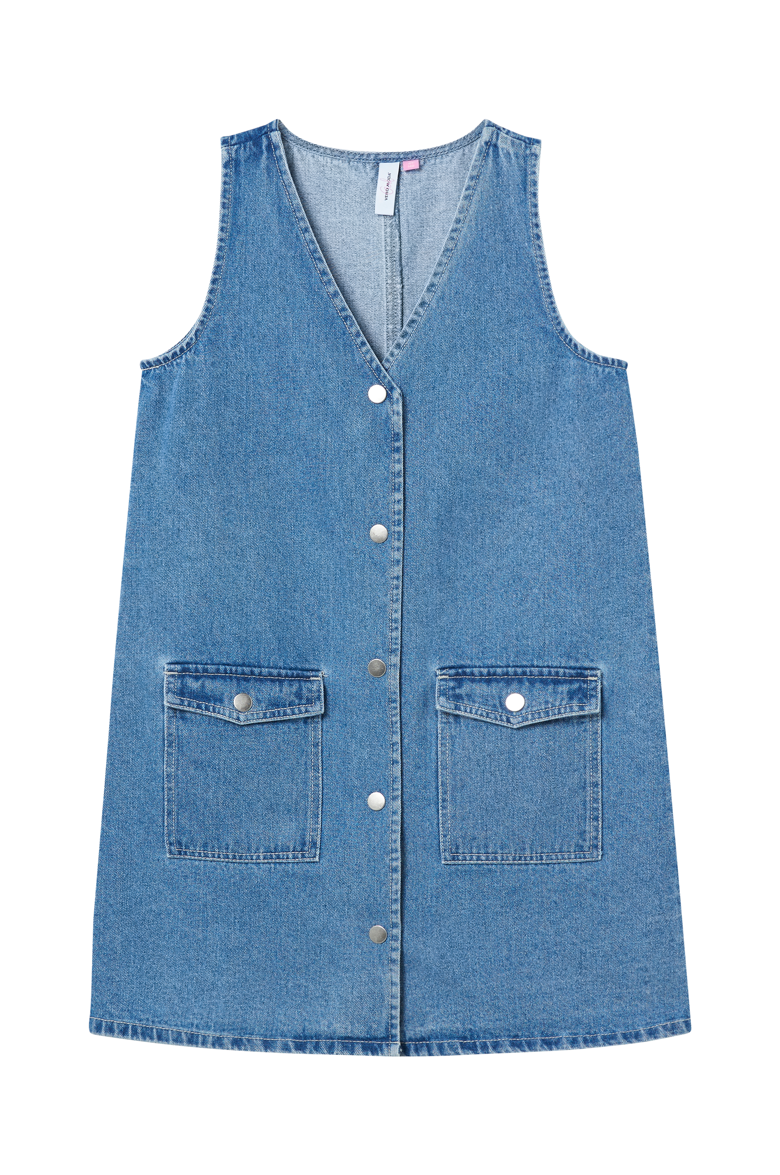 • Ärmlös jeansklänning• Tryckknappar• Två fickor med lock och tryckknapp