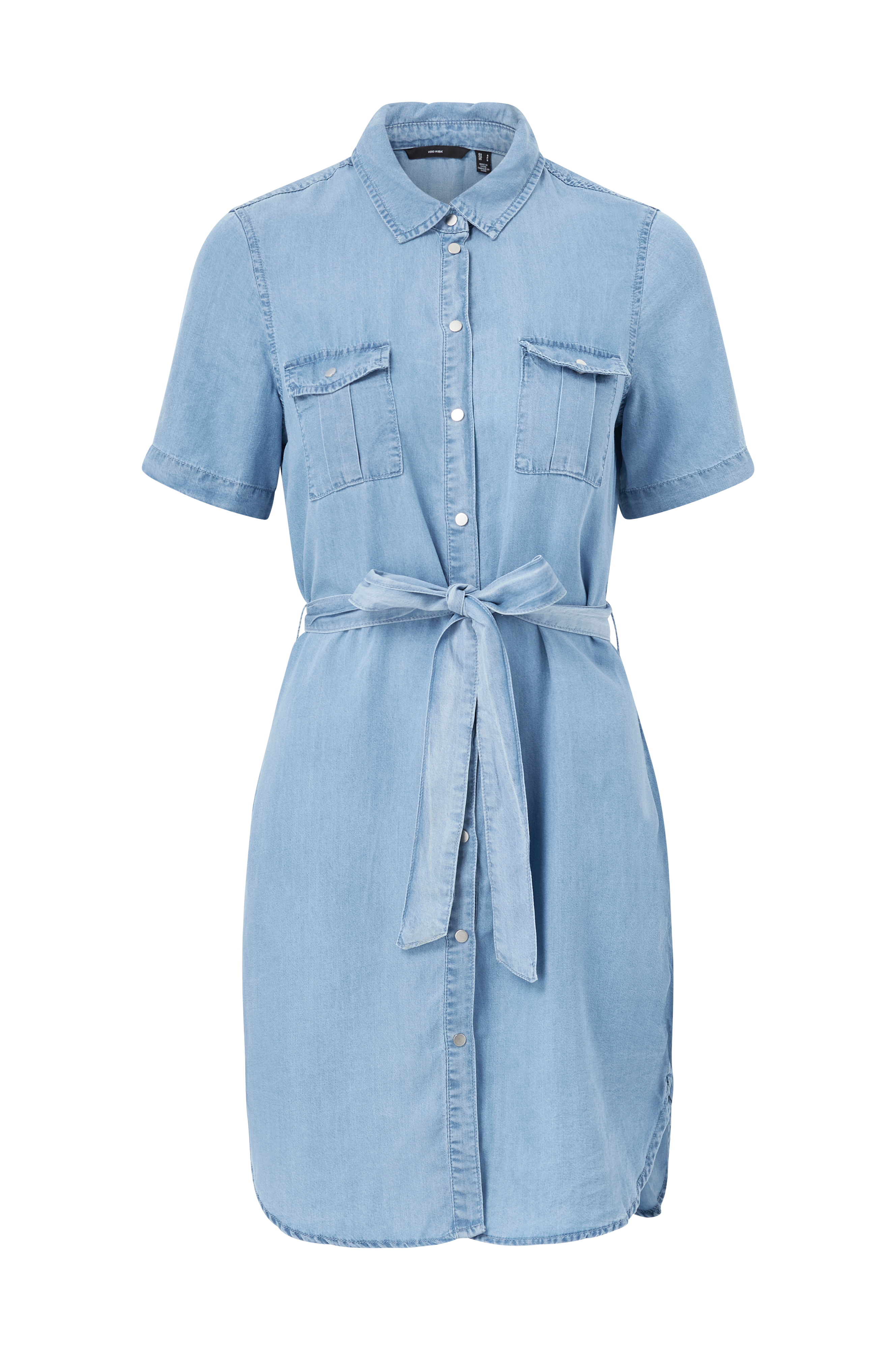Klänning i mjuk denim med lätt figurformad design som har knytskärp i midjan. Kort ärm och liten krage samt knäppning med tryckknappar hela vägen ner. Två bröstfickor med lock och rundskuren nederkant. Längd ca 93 cm i stl S.