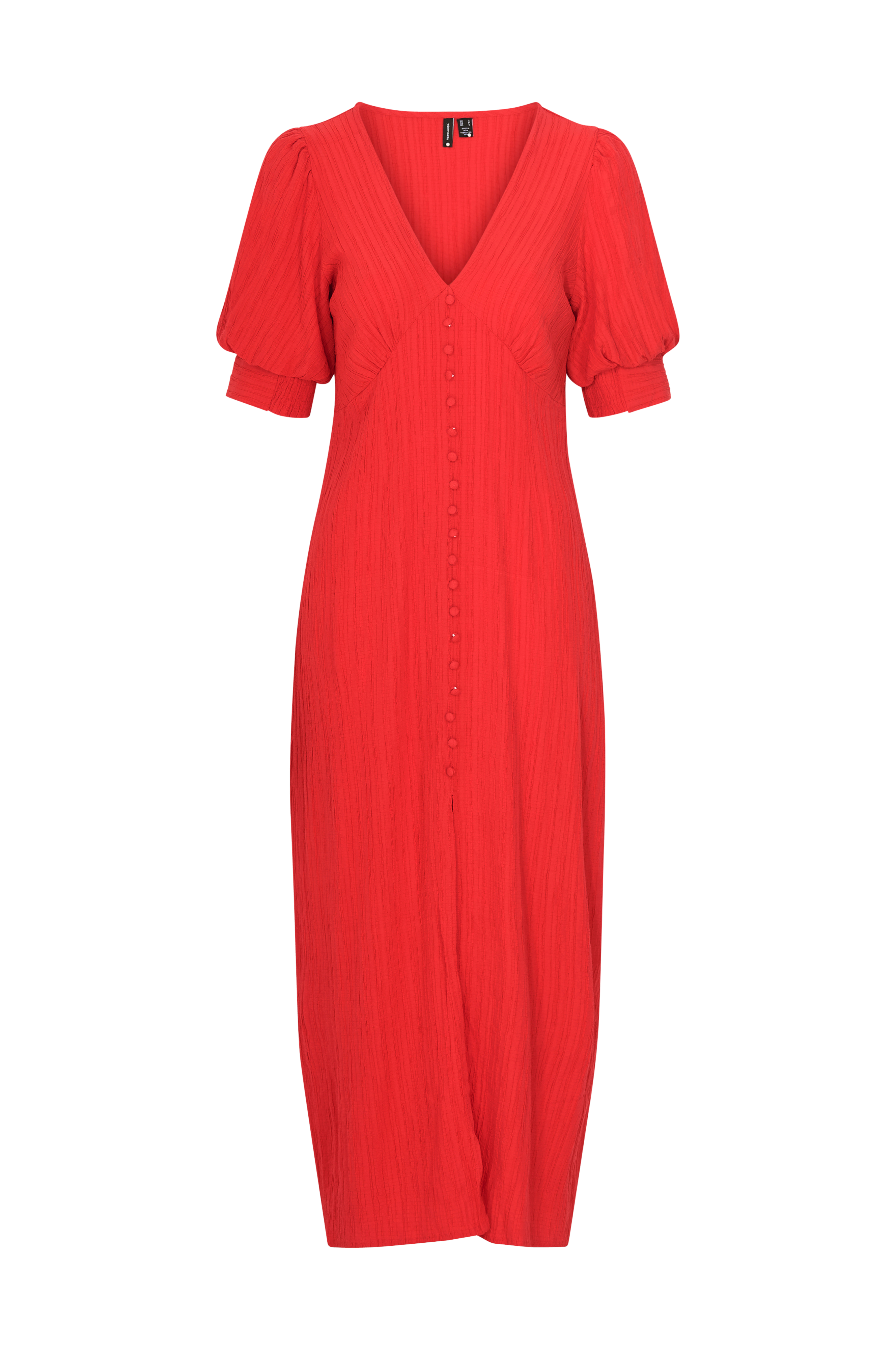 • Ankellång, figurformad klänning• V-ringning• Dekorativa knappar fram• Halvlånga puffärmar• Slits fram• Strukturmönster• Längd: 127 cm i storlek S