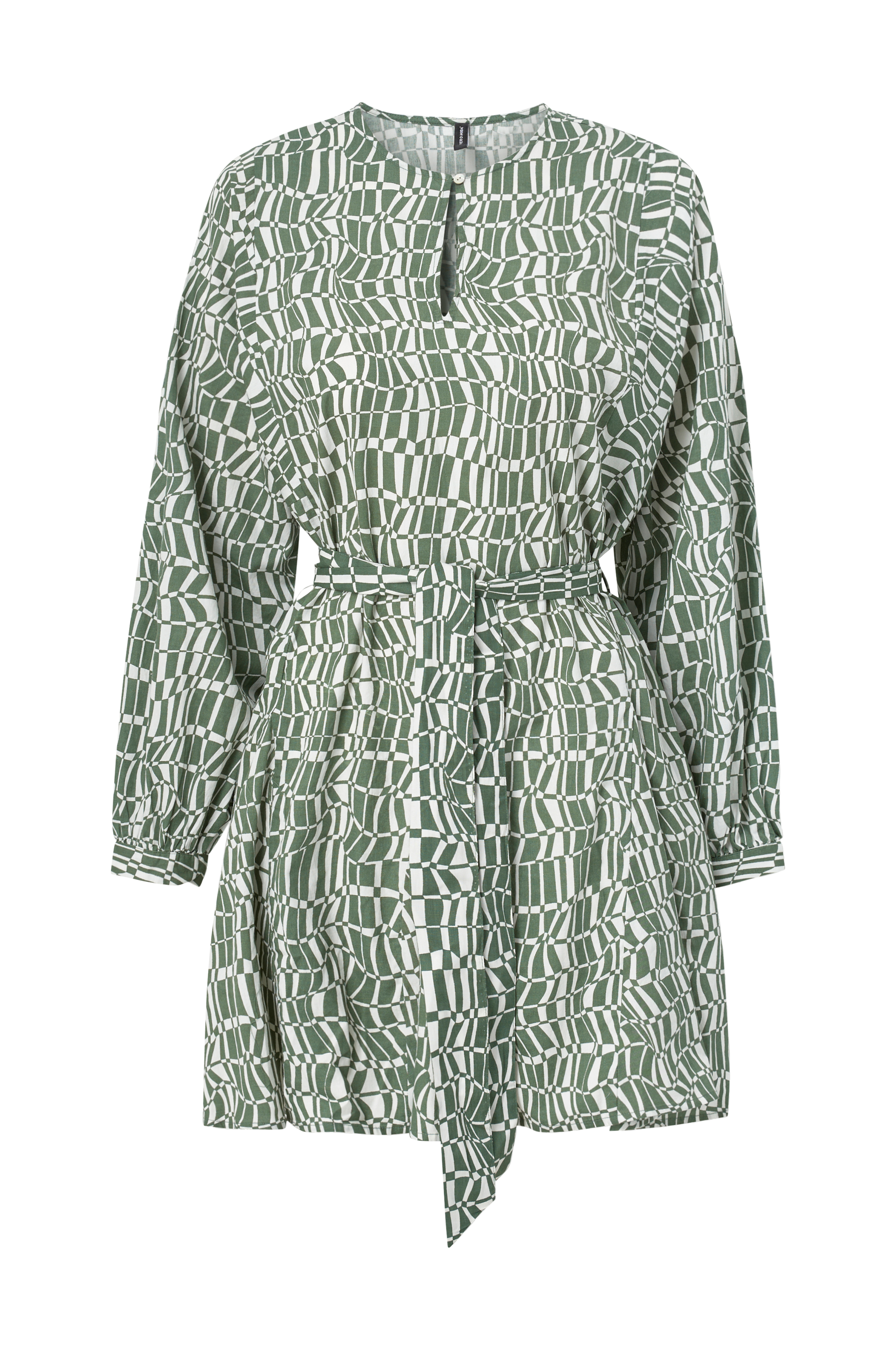 • Kort, utsvängd klänning• Rund hals med sprund och knapp fram• Långa ballongärmar med smal manschett• Knytskärp i midjan• Längd: 88 cm i storlek S