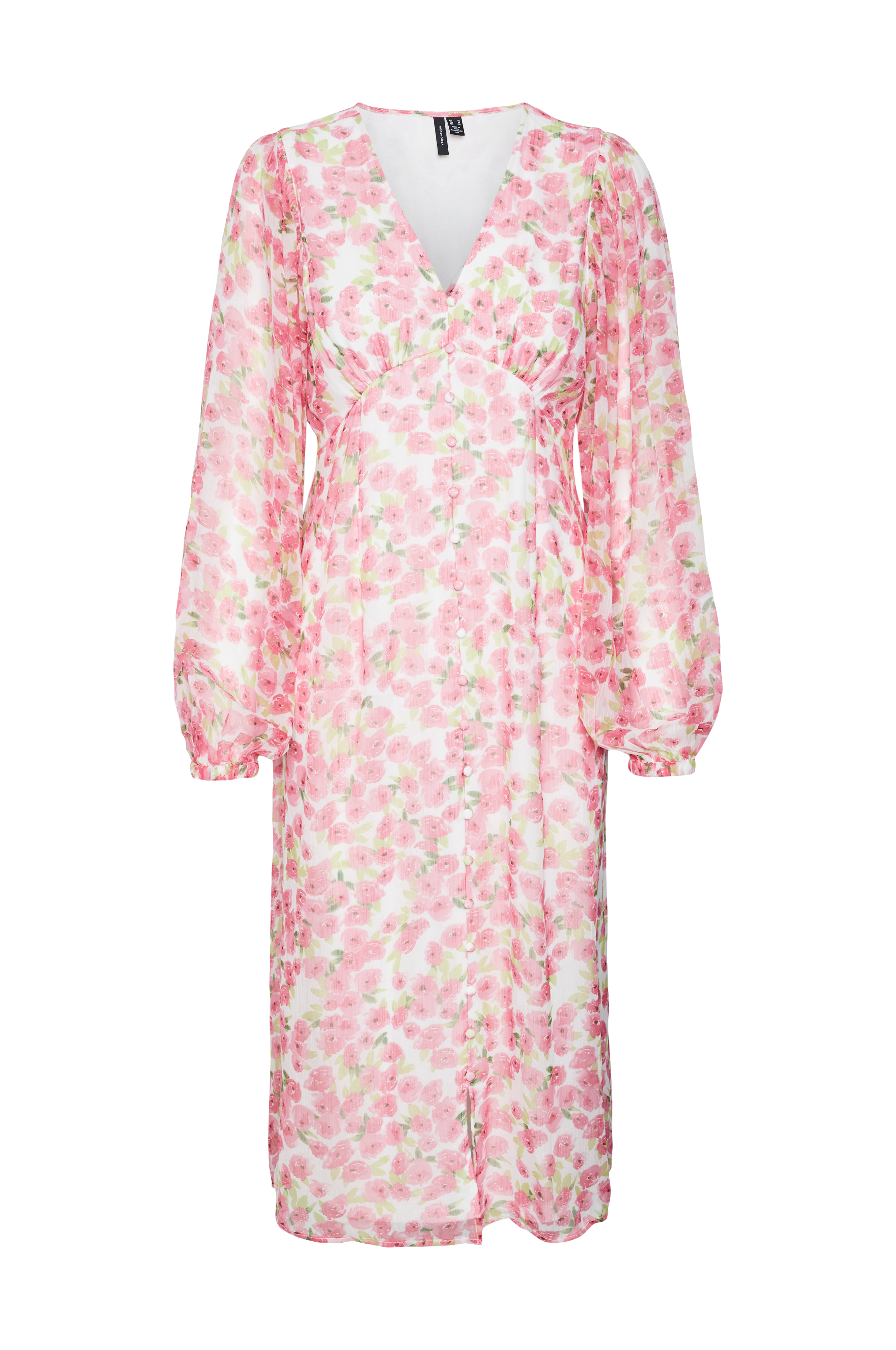 • Klänning med tryckt mönster • V-ringning • Klädda knappar hela vägen fram • Långa puffärmar med resår i ärmsluten • Elastisk midja • Fodrad • Längd: 117 cm i storlek S