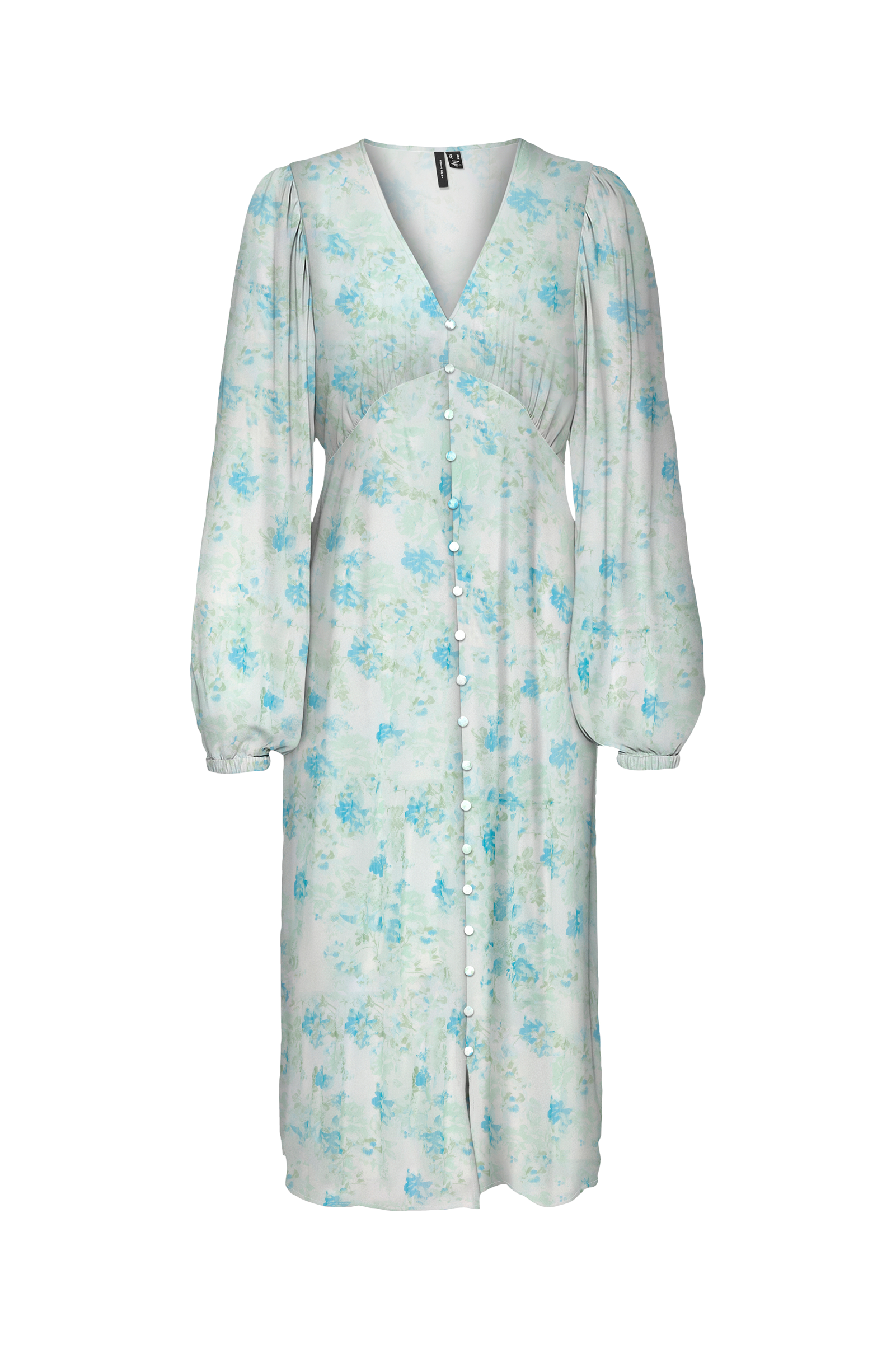 • Klänning med tryckt mönster • V-ringning • Klädda knappar hela vägen fram • Långa puffärmar med resår i ärmsluten • Elastisk midja • Fodrad • Längd: 117 cm i storlek S