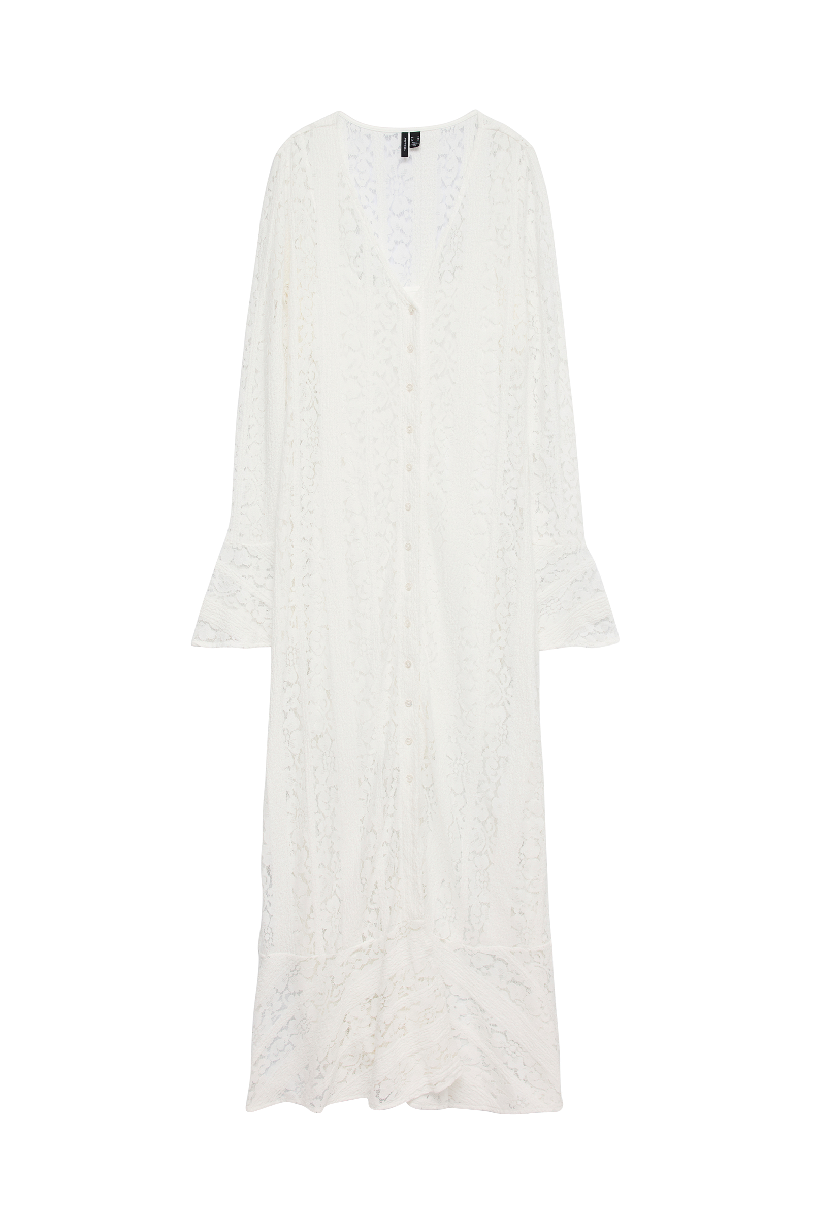 • Lång spetsklänning med knappar hela vägen fram• V-ringad hals• Långa ärmar med volanger i ärmsluten• Höga slitsar nedtill i sidorna• Uttagbar underklänning i trikå• Längd: 141 cm i storlek S