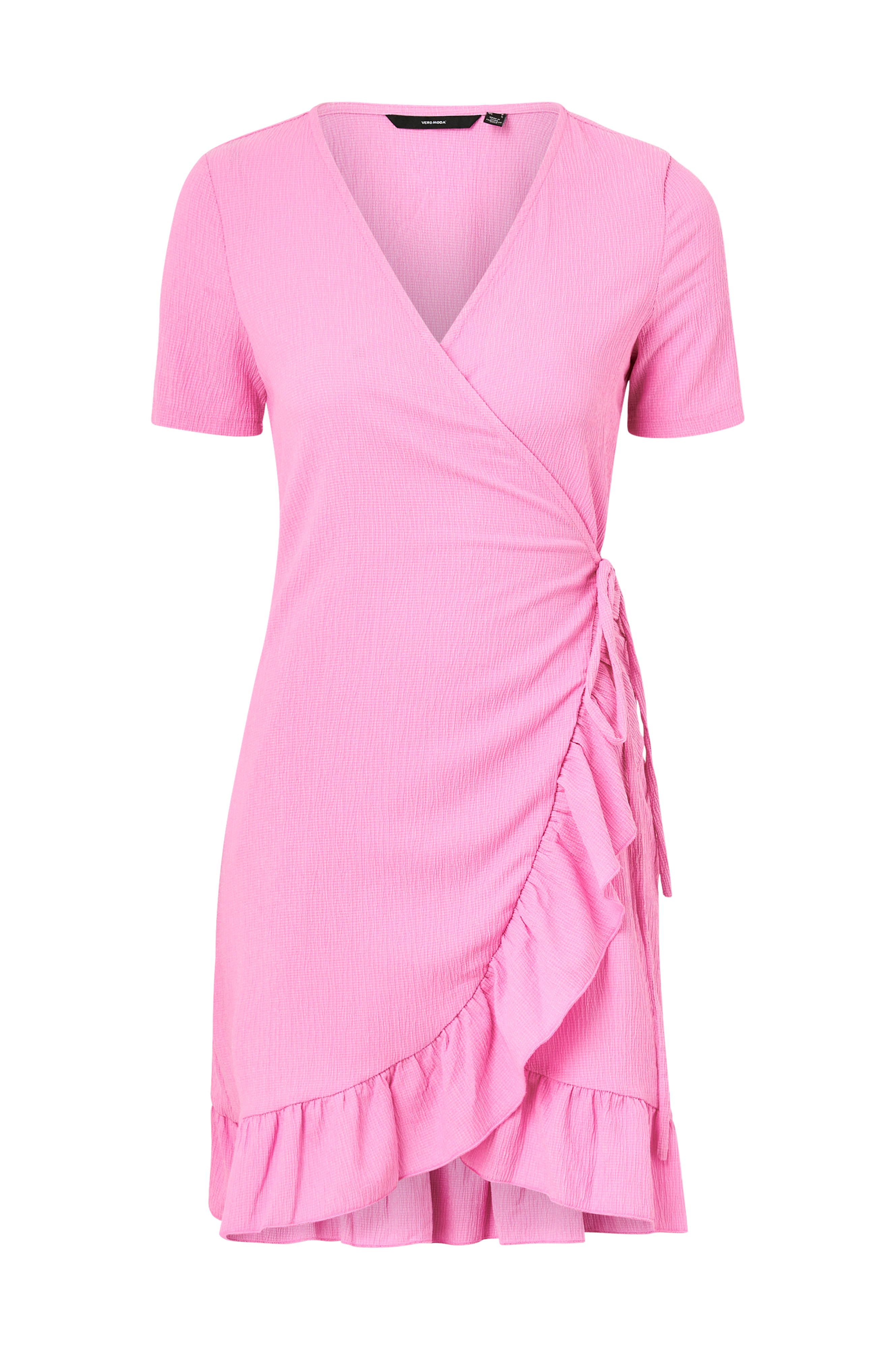 • Kort klänning med knytband i sidan • Omlottdesign • Volang på kjolen • Korta ärmar • Kvalitet med lätt stretch • Längd: 88 cm i storlek S • Produkten innehåller återvunnet material som har tagits tillvara för att minska mängden avfall, samtidigt som nya resurser inte har förbrukats.