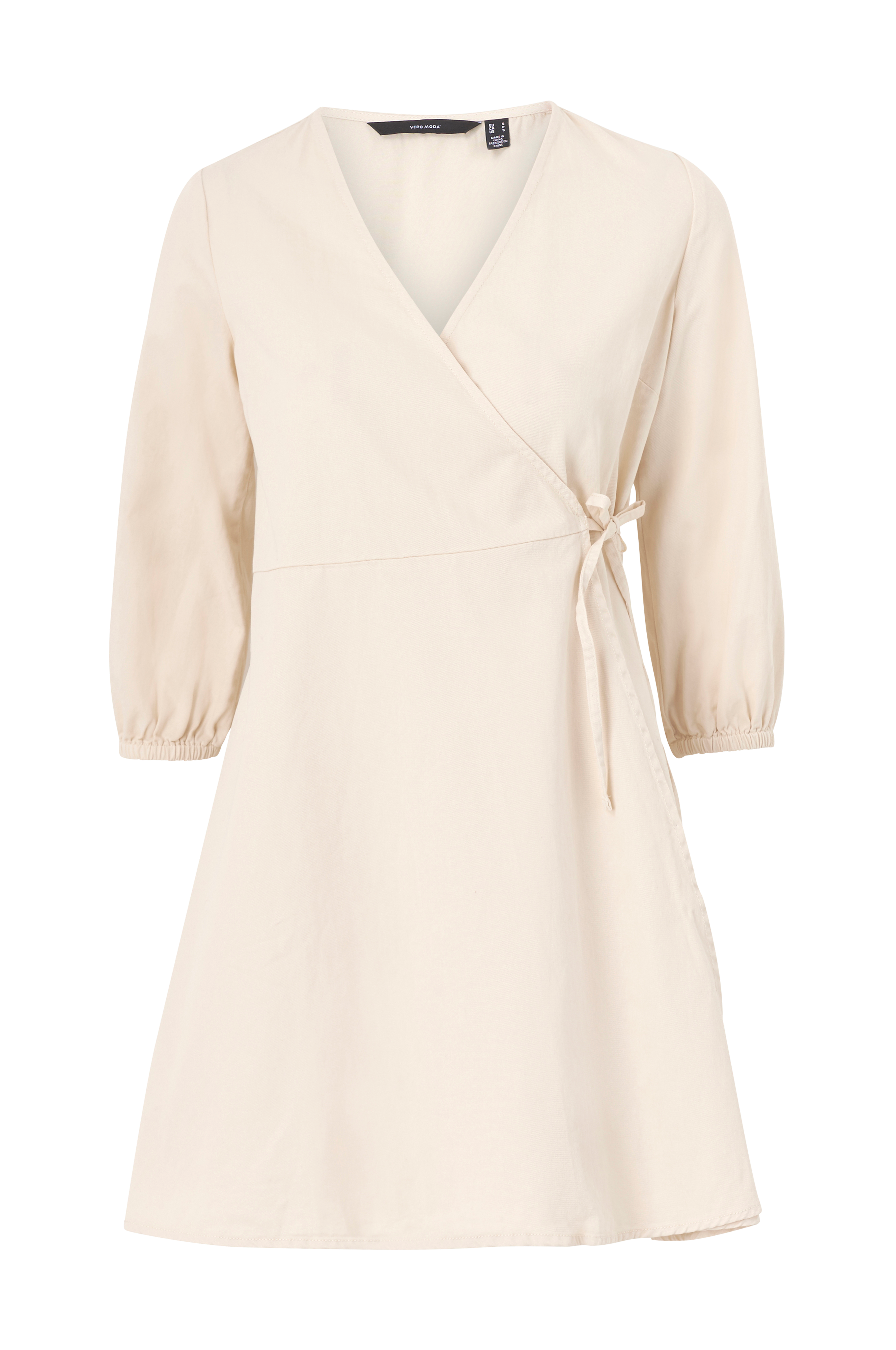 Omlottklänning i vävd kvalitet av ekobomull. Smalt knytband i ena sidan och 3/4-långa ärmar med elastiska ärmslut. Längd ca 87 cm i stl S.