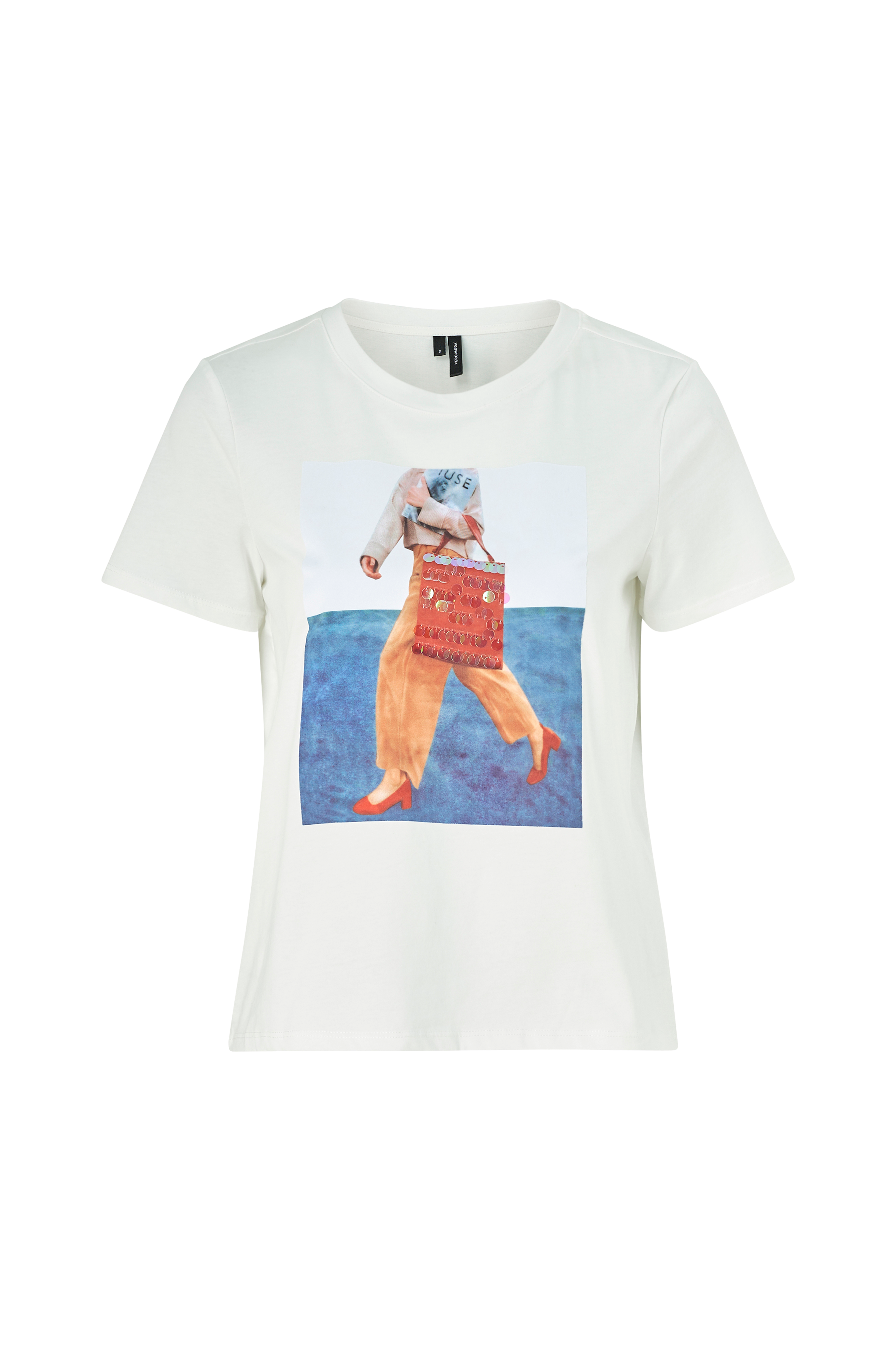Kortärmad topp vmFlamsa S/S från Vero Moda i mjuk bomullstrikå med fototryck och paljettdekorationer fram. Rund halsringning med finribbad kant.