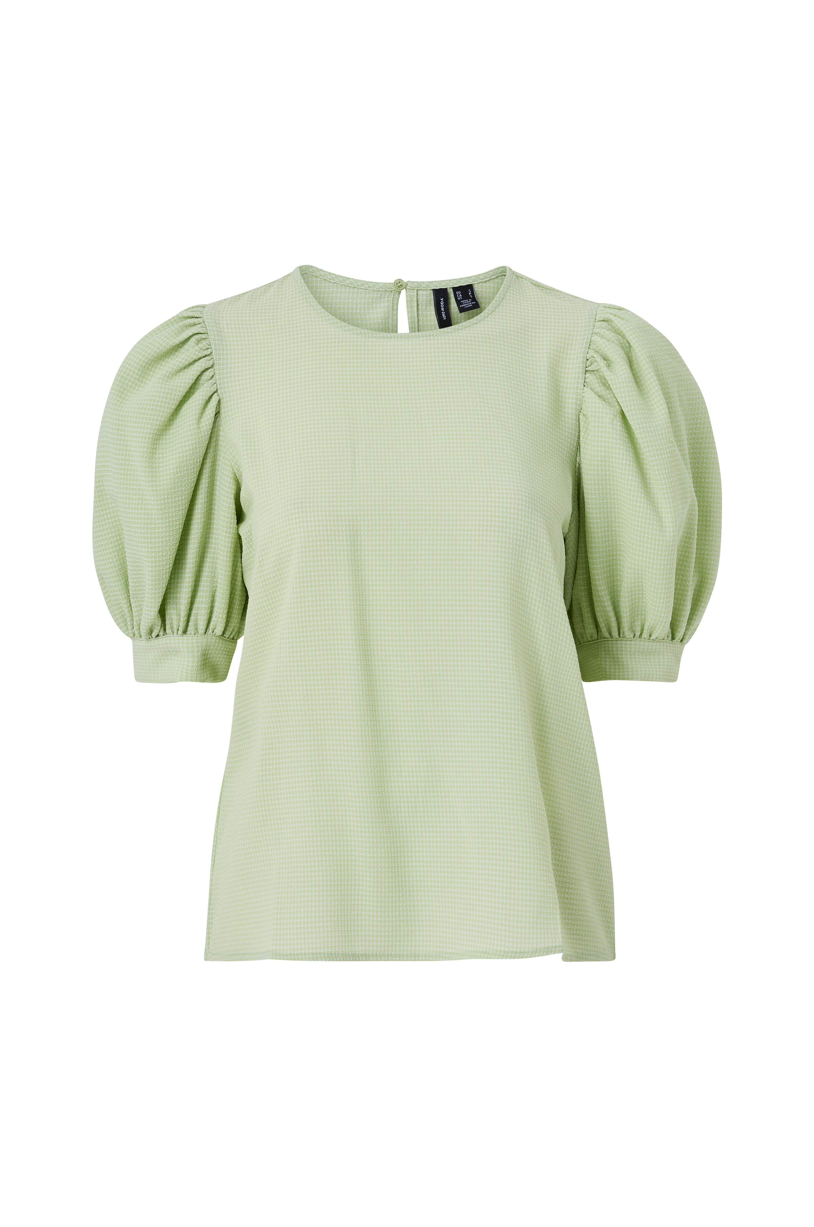 Topp vmIvory 2/4 Top från Vero Moda. Rak modell i strukturvävd kvalitet med ledig form. Rund hals med smal fåll och sprund med knapp i nacken. Halvlång puffärm med rynk vid axeln och manschett i ärmslut.