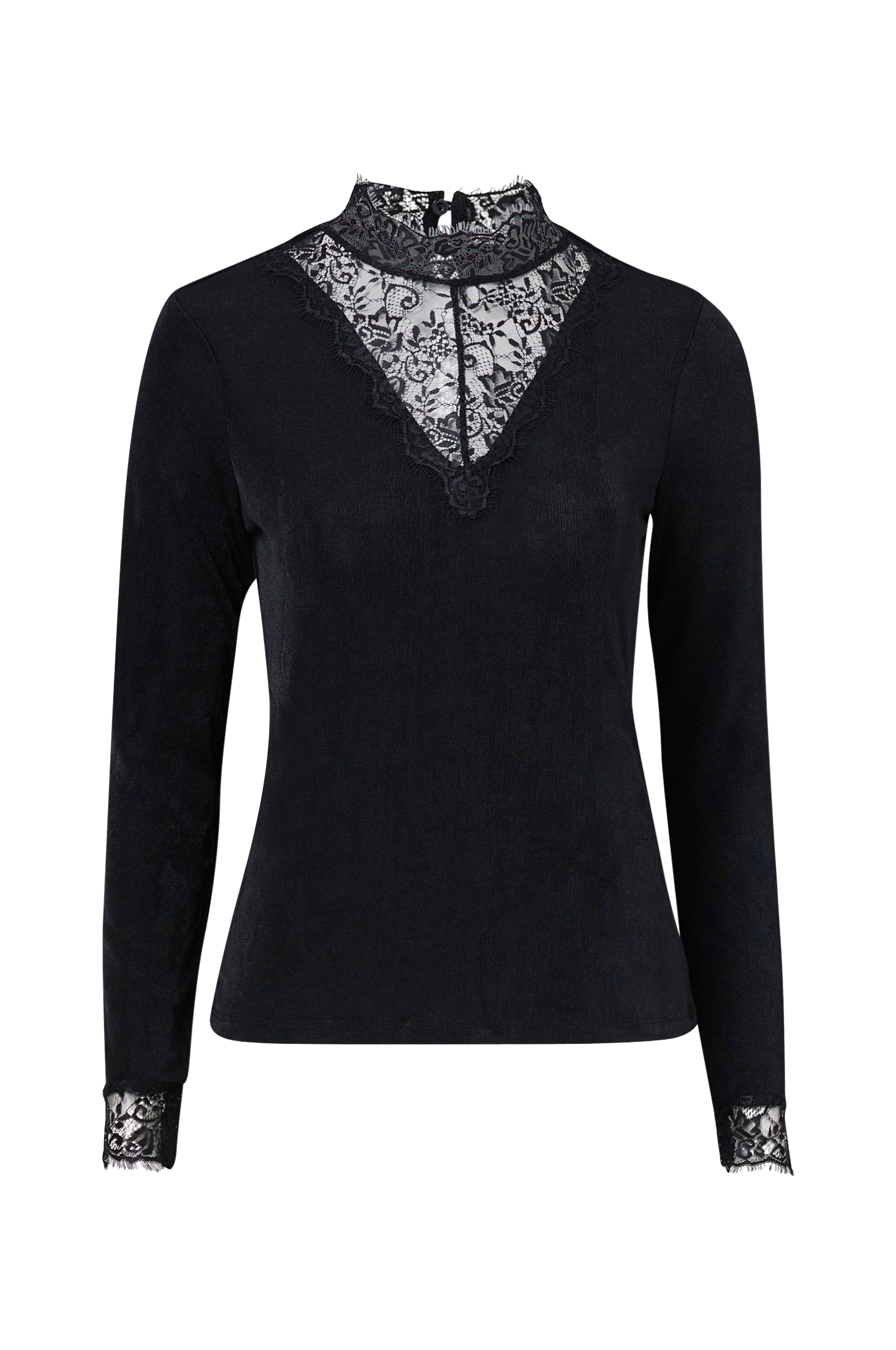 Topp vmKako LS Top från Vero Moda. Lätt figurformad modell i glansig jerseykvalitet med infällning på bröstet i genombruten spets. Även kragkant i spets med sprund och knapp i nacken samt påsydd spets i ärmslut.