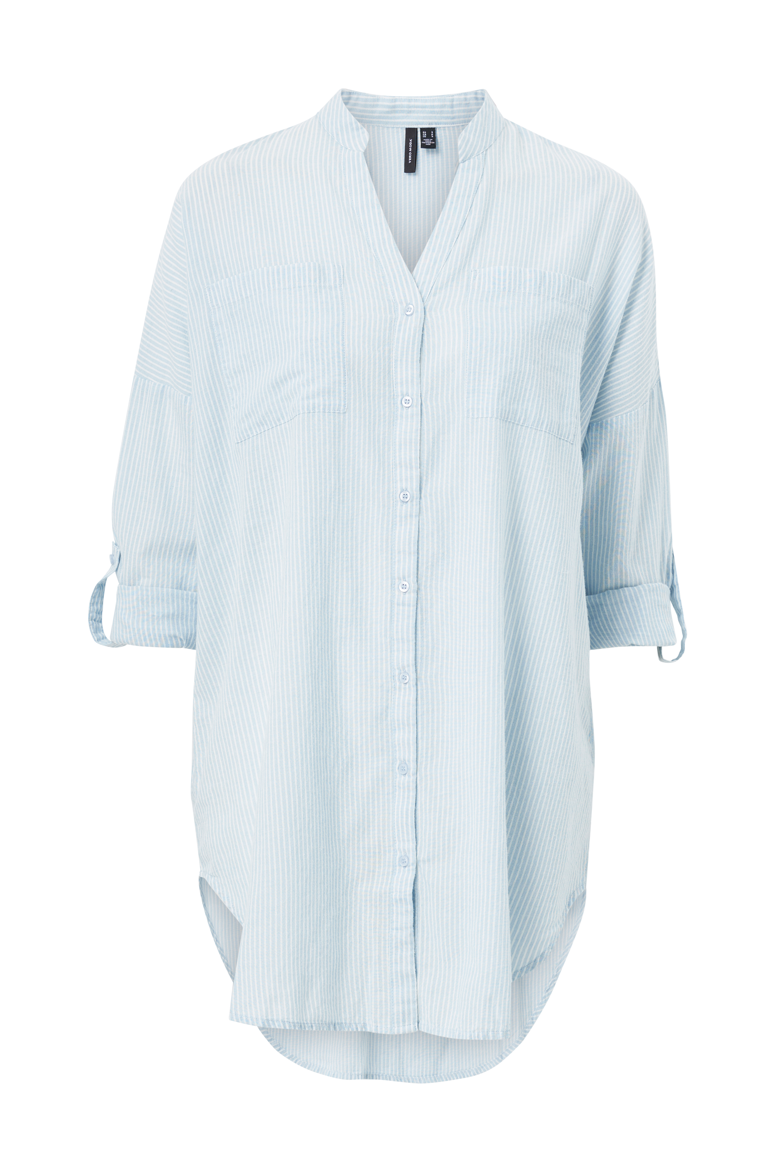 Lång, rak modell i ledig form med rund hals som har påsydd kant med v-ringning fram. Två påsydda bröstfickor och knäppning hela vägen ner samt lång ärm med manschett i ärmslut och invändig knäpptamp för uppvik. Rundskurna sprund nertill i sidorna. Längd ca 90 cm i stl S.