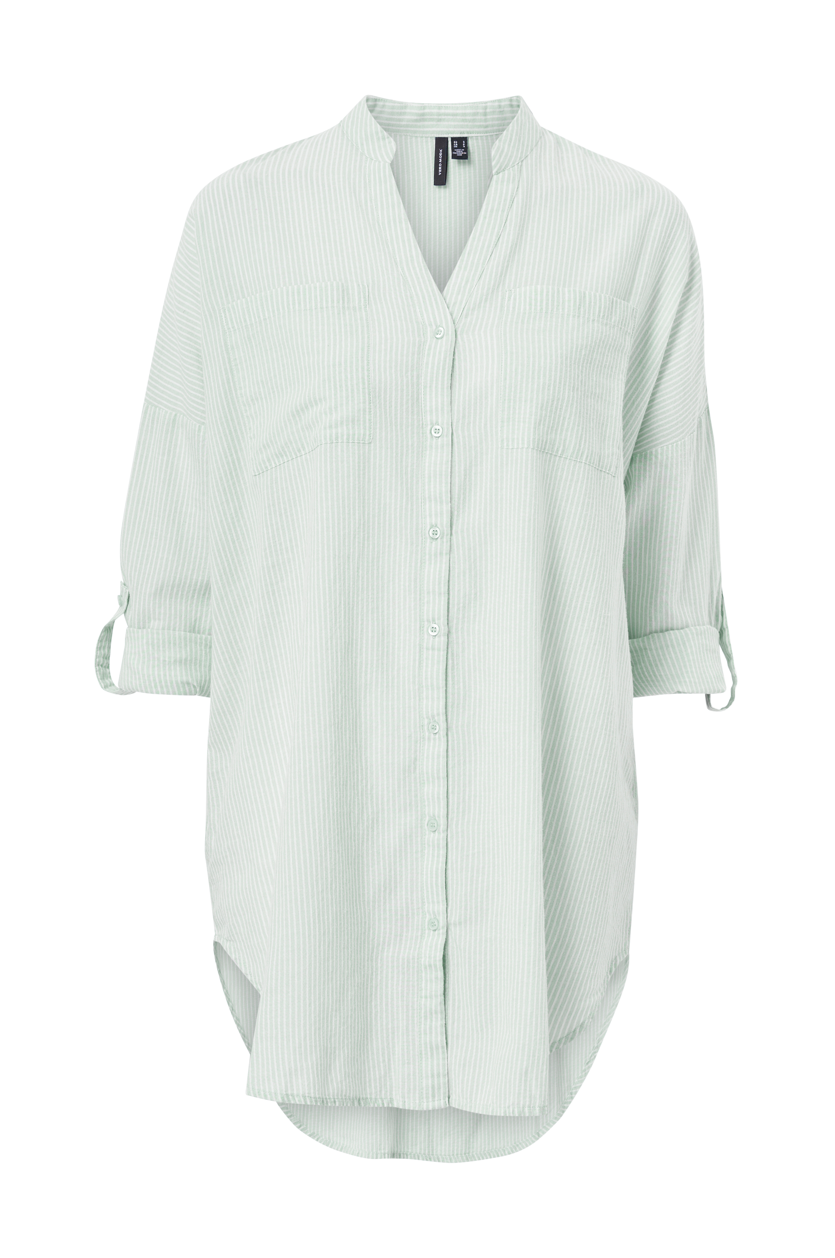 Lång, rak modell i ledig form med rund hals som har påsydd kant med v-ringning fram. Två påsydda bröstfickor och knäppning hela vägen ner samt lång ärm med manschett i ärmslut och invändig knäpptamp för uppvik. Rundskurna sprund nertill i sidorna. Längd ca 90 cm i stl S.