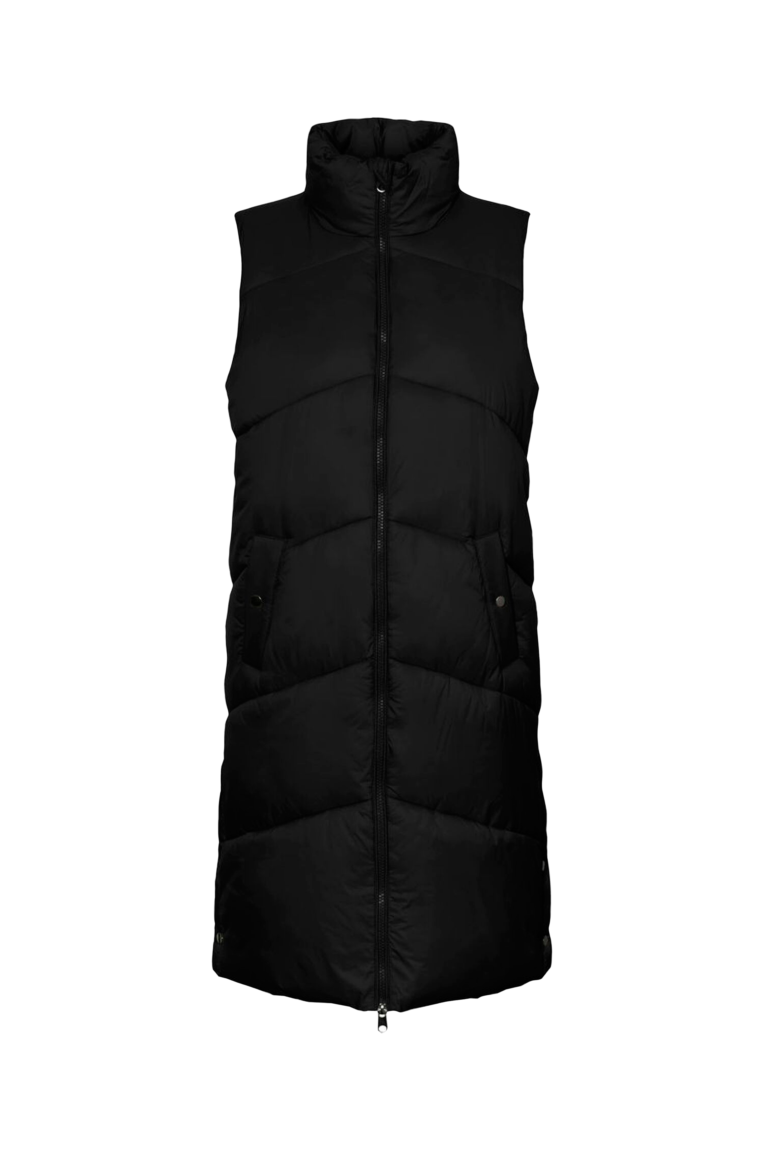 • Quiltad, vadderad väst • Hög krage • Tvåvägsdragkedja • Två fickor med tryckknappsstängning • Slitsar med tryckknappar nedtill i sidorna • Längd: 95 cm i storlek XXL