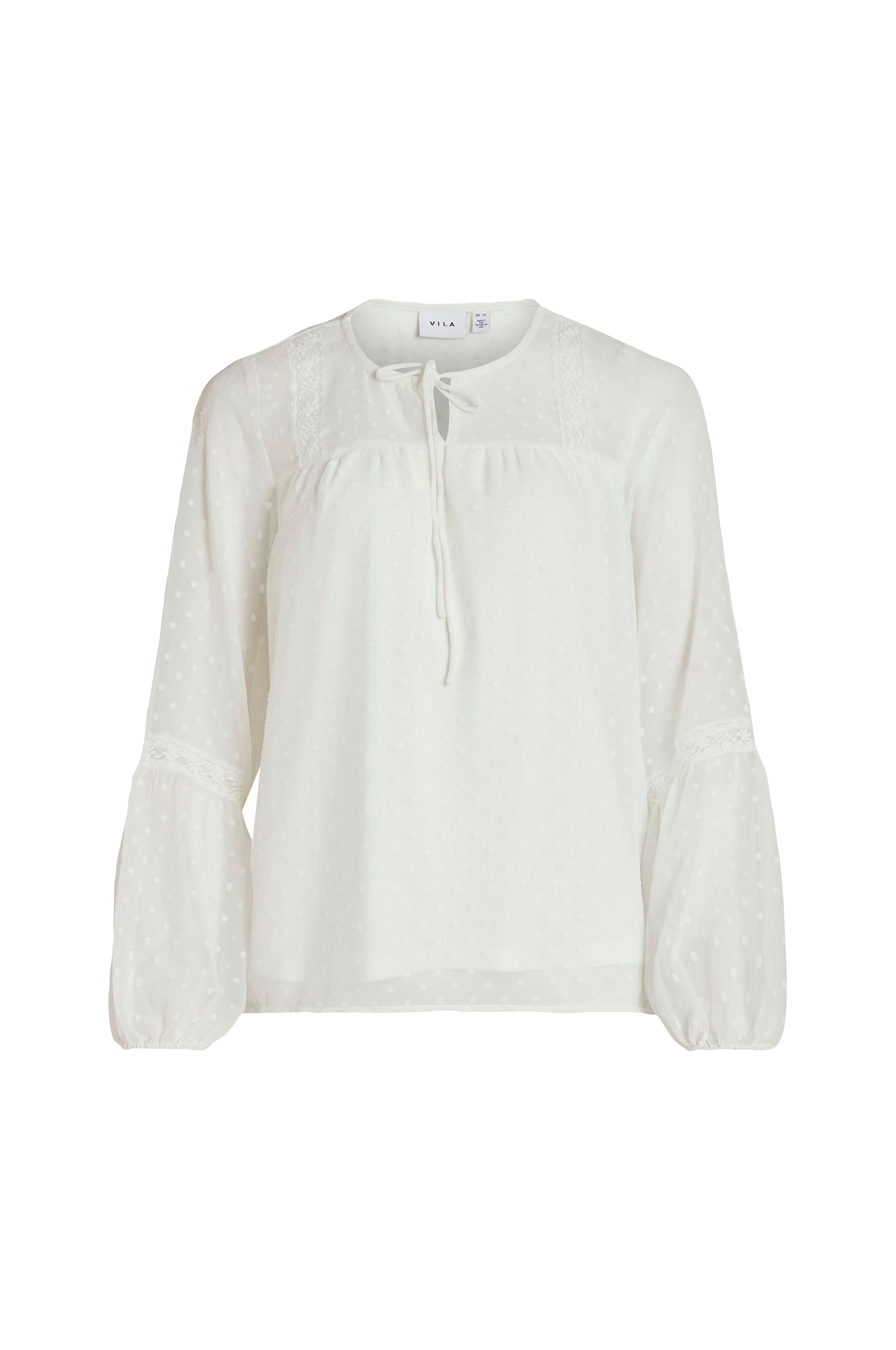 • Blus i chiffong med strukturmönster • Knytband i halsen • Transparenta ballongärmar med spets • Trikåfoder • Produkten innehåller återvunnet material som har tagits tillvara för att minska mängden avfall, samtidigt som nya resurser inte har förbrukats.