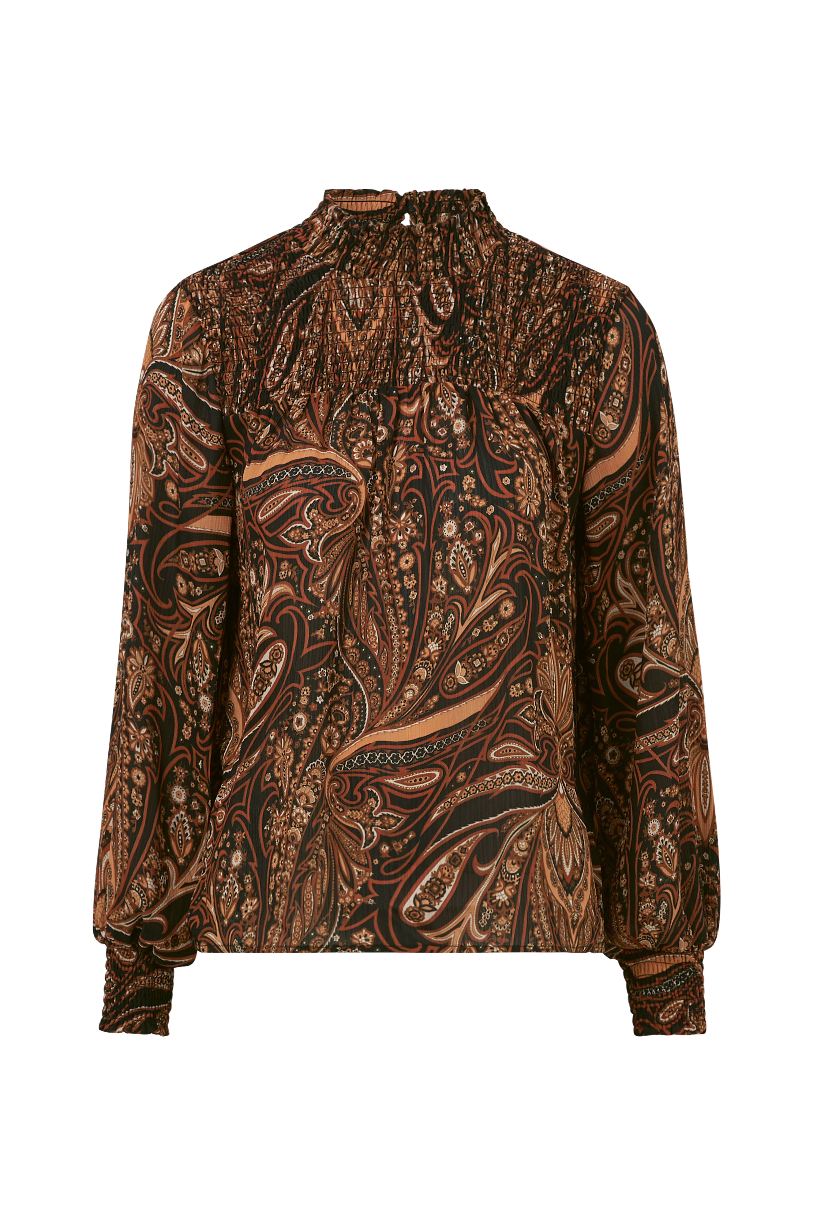 Blus i vävd chiffongkräpp med bred smockresår på bröstet. Lite högre krage i smockresår med sprund och knappar i nacken. Extra vid ärm med smockresår i ärmslut.