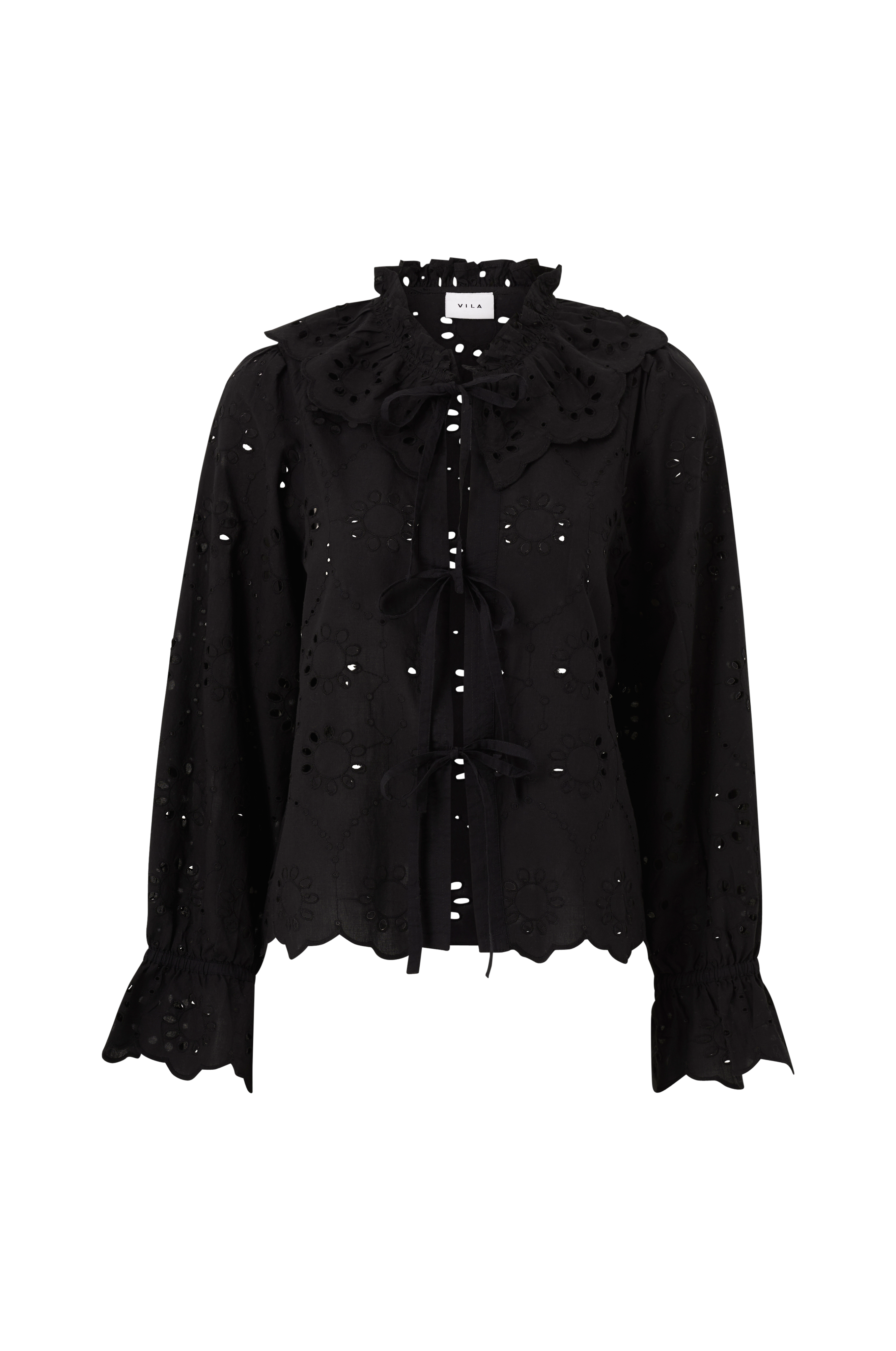 • Blus med broderat hålmönster• Knytband fram• Volang i halsen• Ballongärmar med volang i ärmsluten