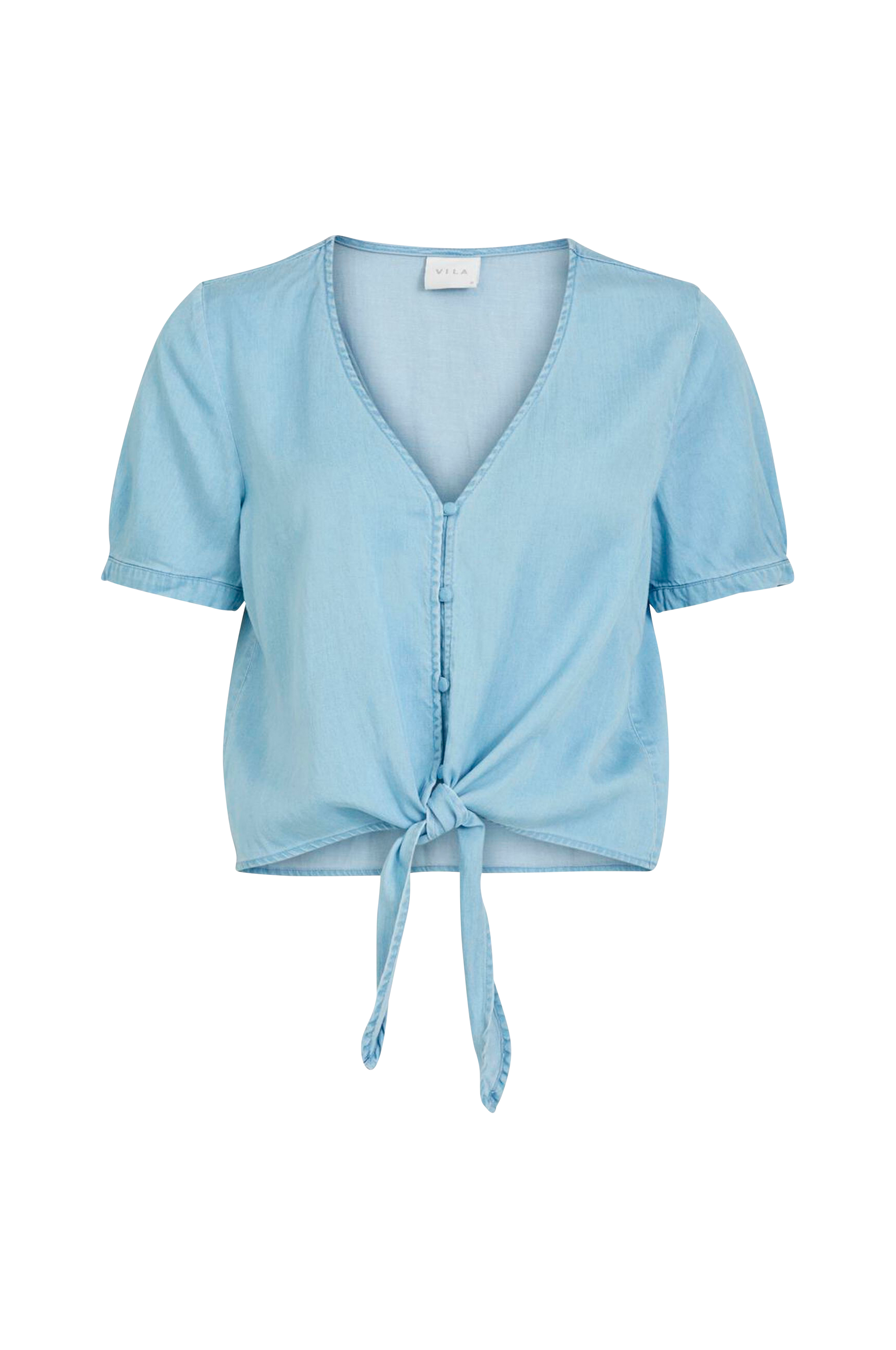 Blus i kort, lite vidare modell med knyt fram i nederkanten. V-ringad hals och ögleknäppning med klädda knappar fram samt kort ärm lagt motveck nertill.