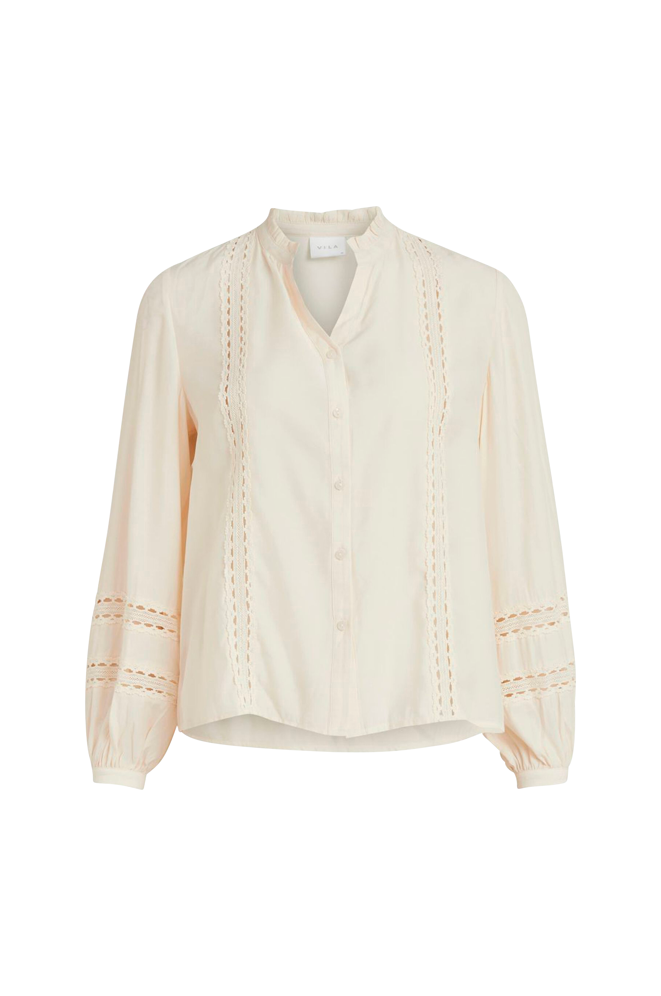Rak modell i vävd kvalitet med infälld spets fram samt nertill på ärmen. Rund hals med liten volangkant och v-ringning fram som övergår i knappslå hela vägen ner. Vid ärm med manschett i ärmslut.