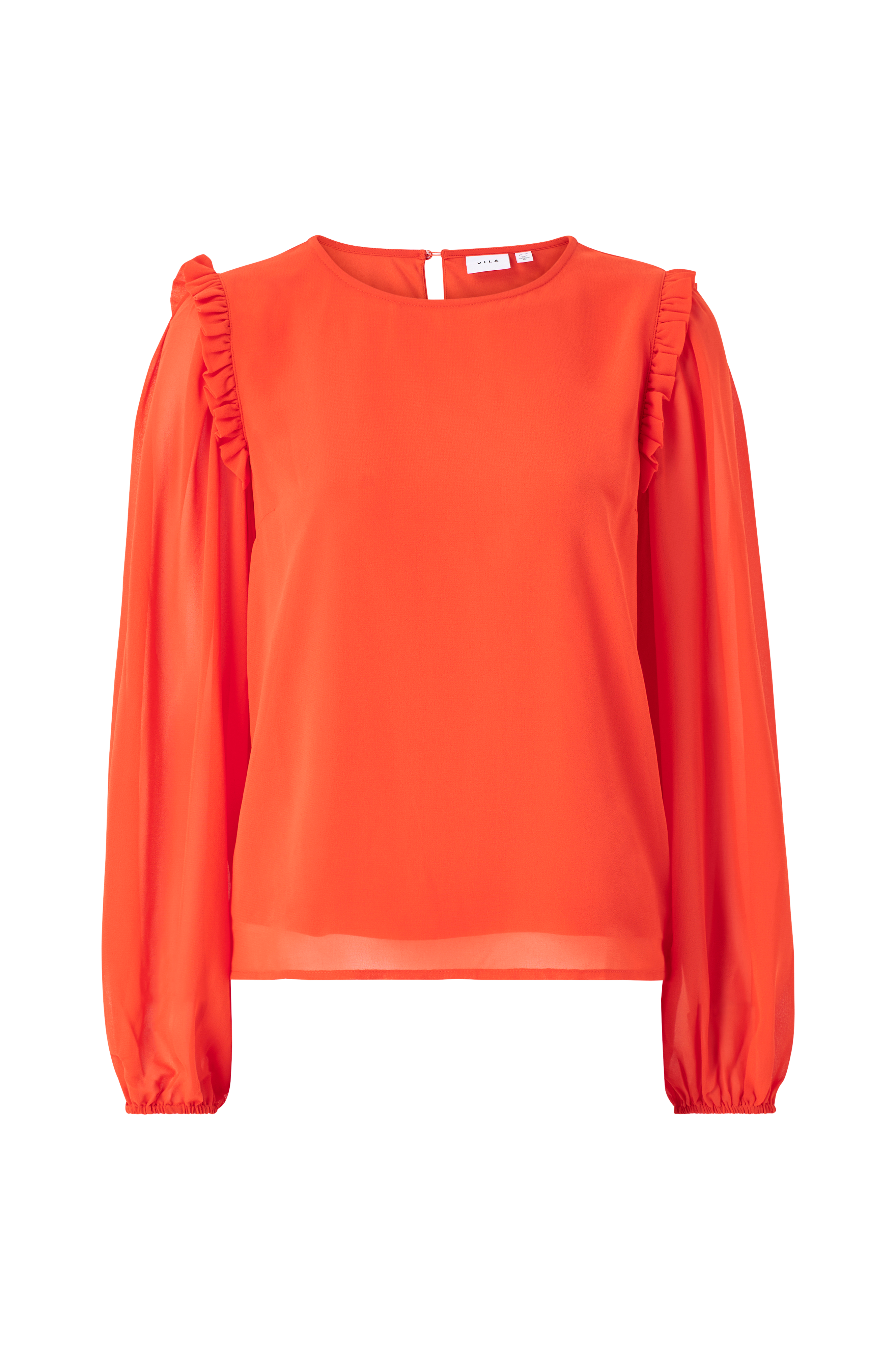 • Fodrad blus • Transparent material med ogenomskinligt foder • Rund halsringning • Sprund med knapp i nacken • Volangkanter runt axlarna • Ballongärmar med resår i ärmsluten • Produkten innehåller återvunnet material som har tagits tillvara för att minska mängden avfall, samtidigt som nya resurser inte har förbrukats.