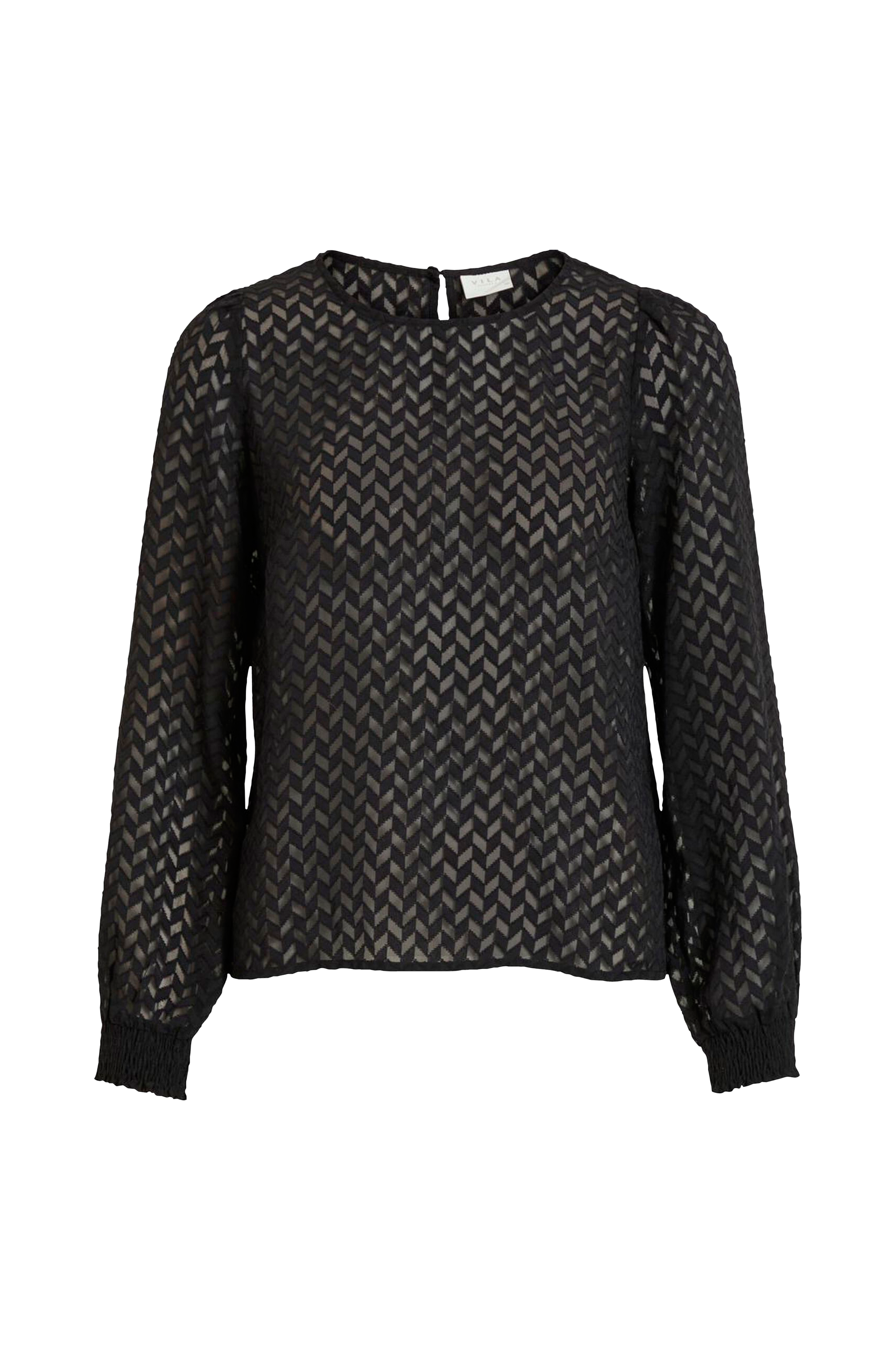 Blus viPartisan L/S Top från Vila i tunn, semitransparent chiffong med vävt strukturmönster. Långa ärmar med smockresår i ärmsluten. Rund hals med sprund och knapp i nacken.