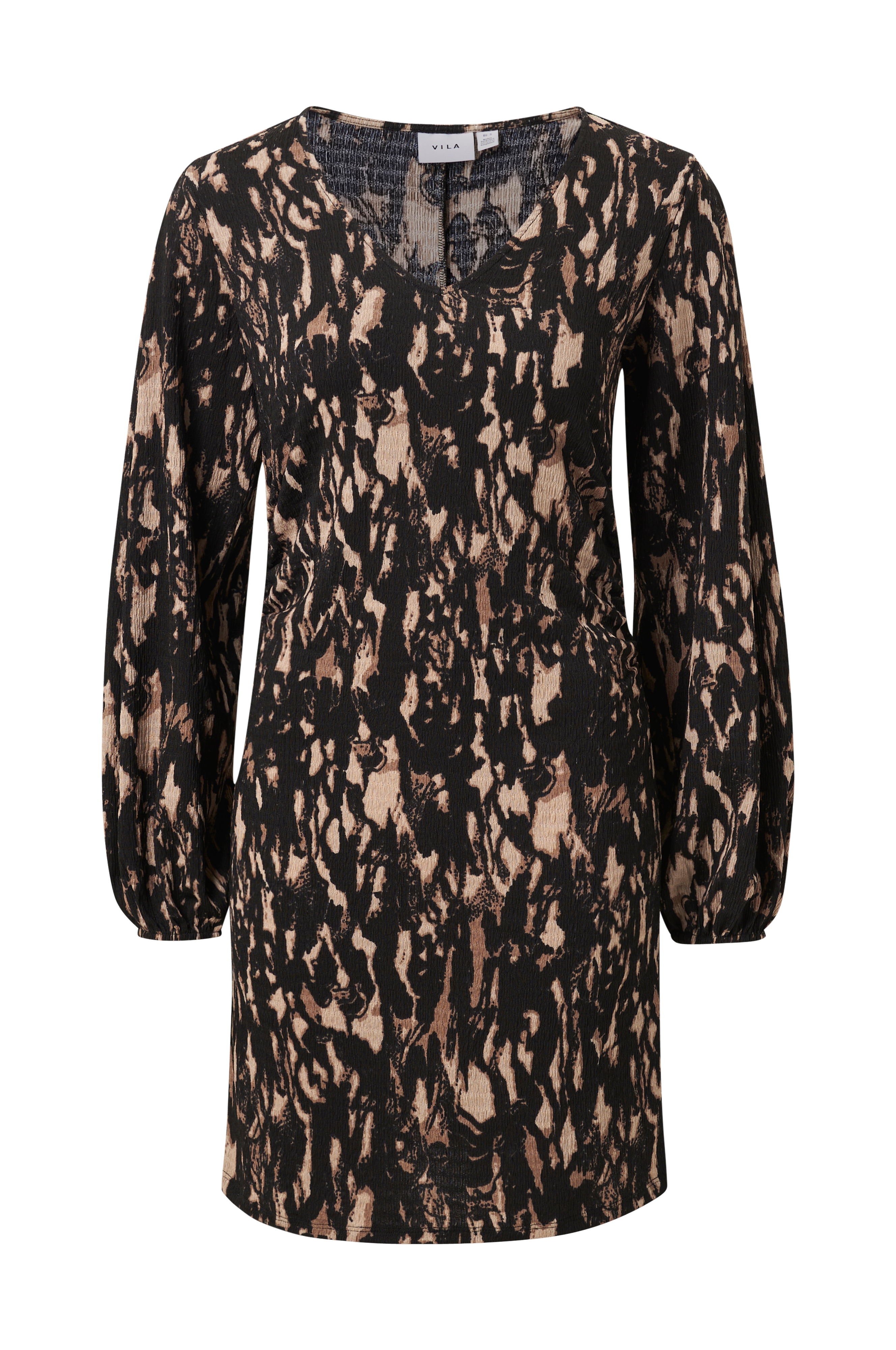• Figurnära klänning • Drapering i sidorna • V-ringning • Ballongärmar med elastiska ärmslut • Kräppad stretchkvalitet • Längd: 90 cm i storlek S • Produkten innehåller återvunnet material som har tagits tillvara för att minska mängden avfall, samtidigt som nya resurser inte har förbrukats.