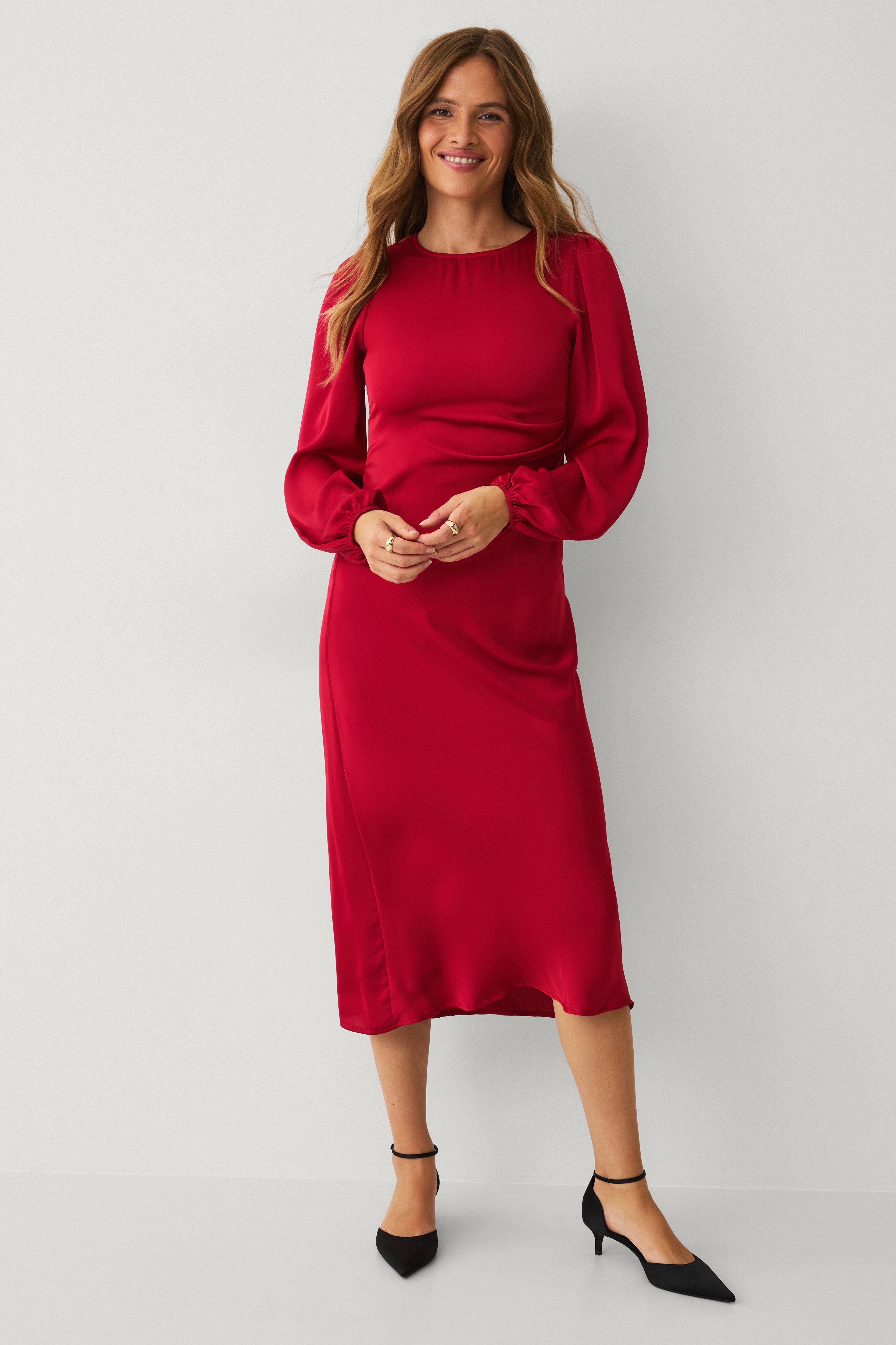 • Klänning i satin• Rund halsringning• Långa puffärmar• Resår i ärmsluten• Dragkedjestängning i ryggen• Drapering i ena sidan• Normal passform• Längd: 128 cm i storlek 36
