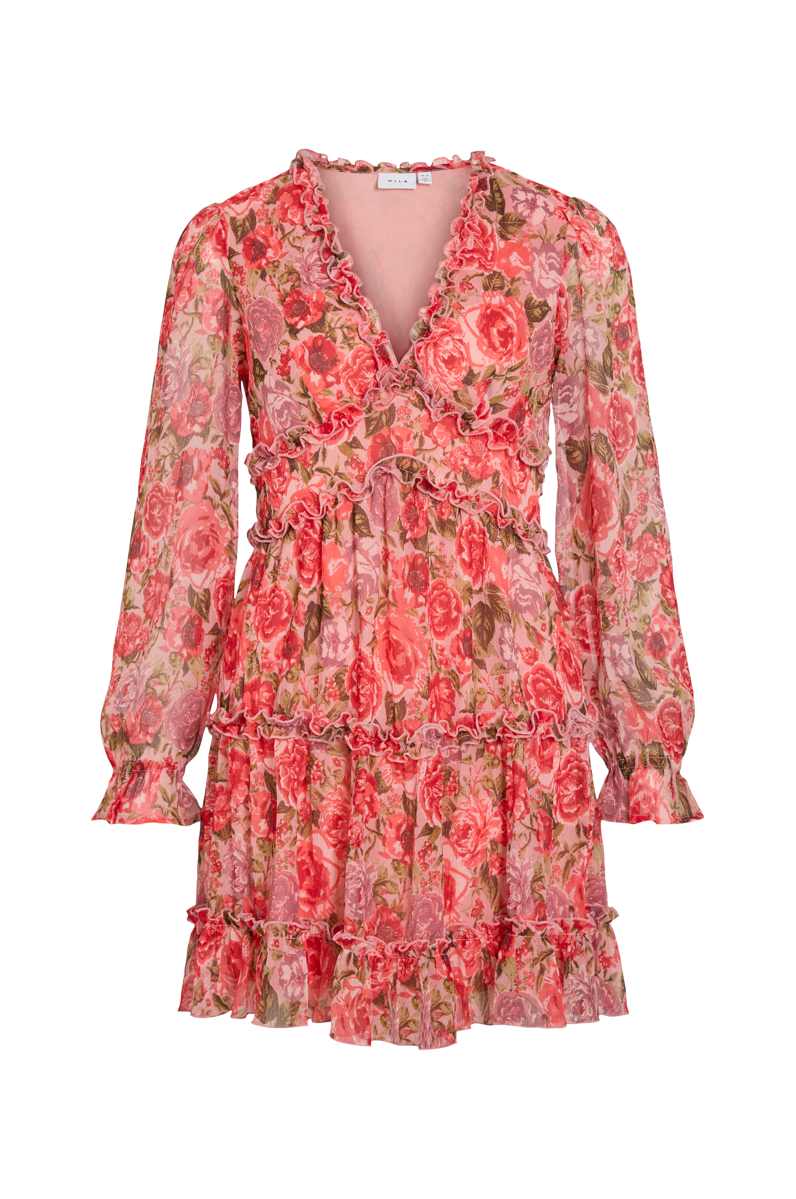 • Kort klänning i chiffong• Volangdetaljer• V-ringning• Transparenta ärmar med volang i ärmsluten• Dold dragkedja i sidan• Trikåfoder• Längd: 84 cm i storlek 36