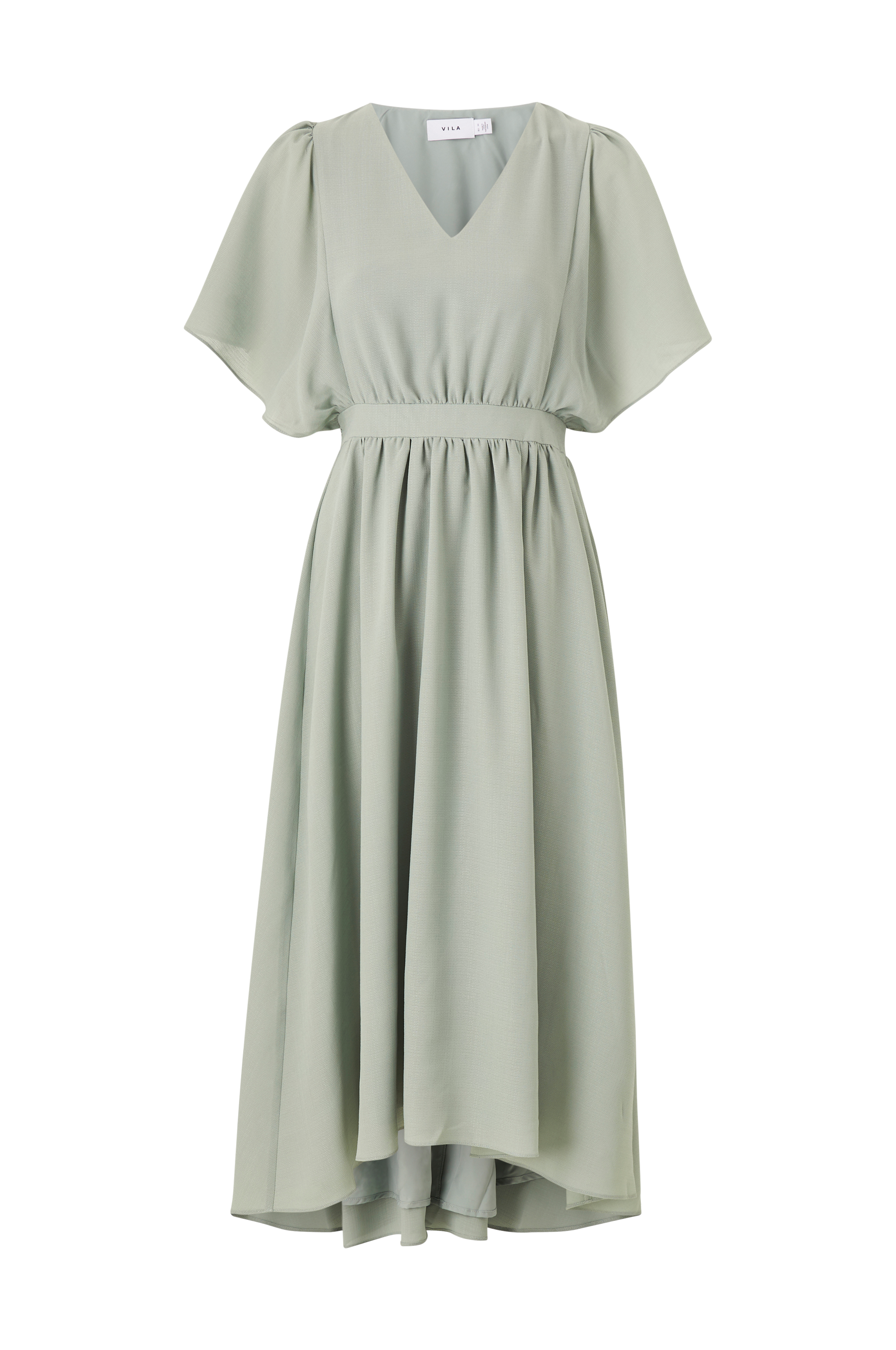 • Korta, vida ärmar• V-ringning• Markerad midja med rynk fram och resår bak• Fodrad• Längd: 127 cm i storlek 36