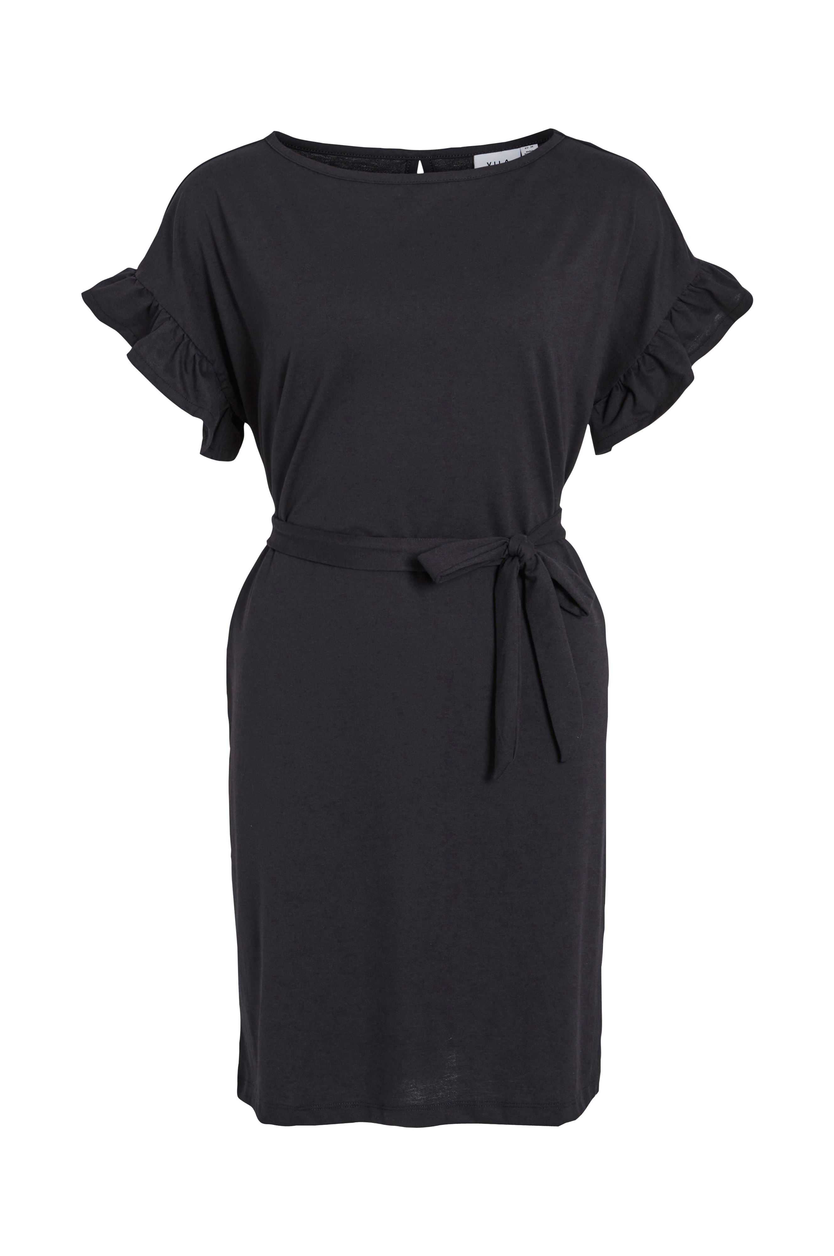 • Rak, vid modell i jersey• Vid hals med droppformat sprund i nacken• Liten volang runt ärmöppningarna• Knytskärp i midjan• Längd: 93 cm i storlek S