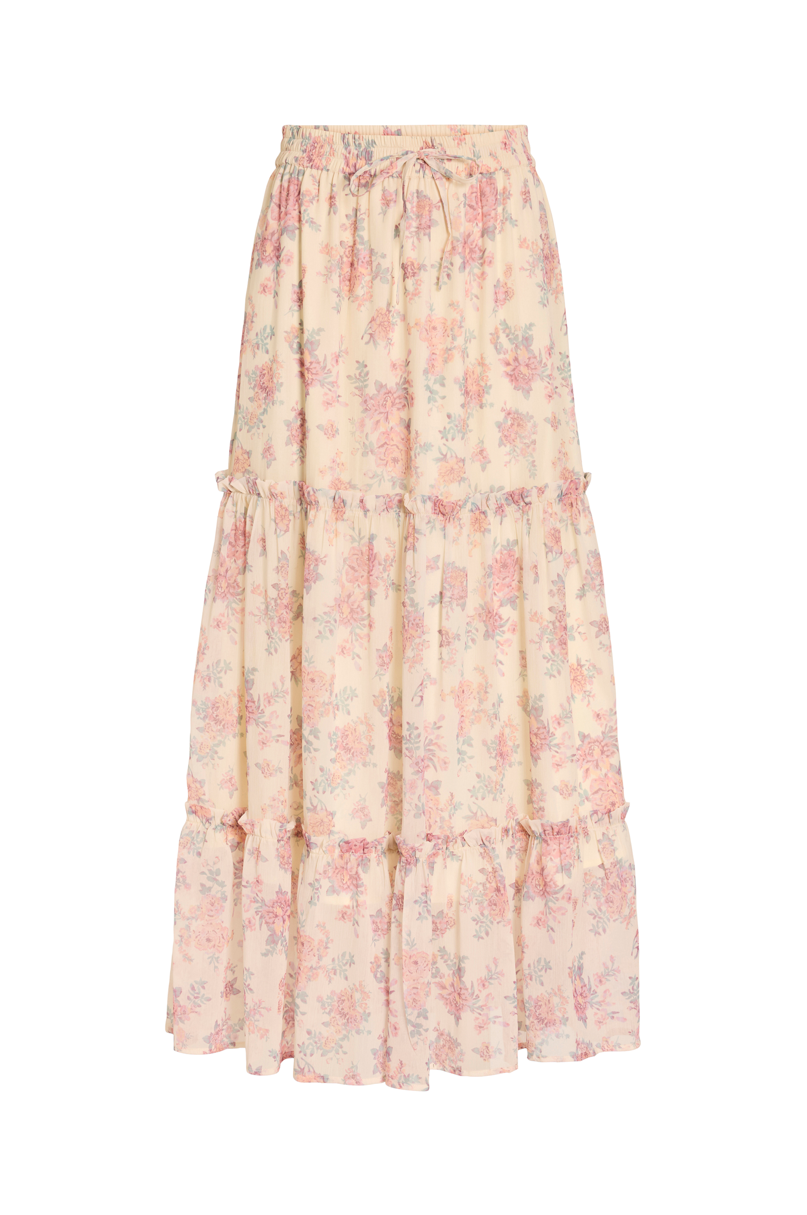 • Fodrad maxikjol i mönstrad chiffong• Bred resår i midjan med dragsko• Dekorativa volanger runt om• Längd: 97 cm i storlek 36