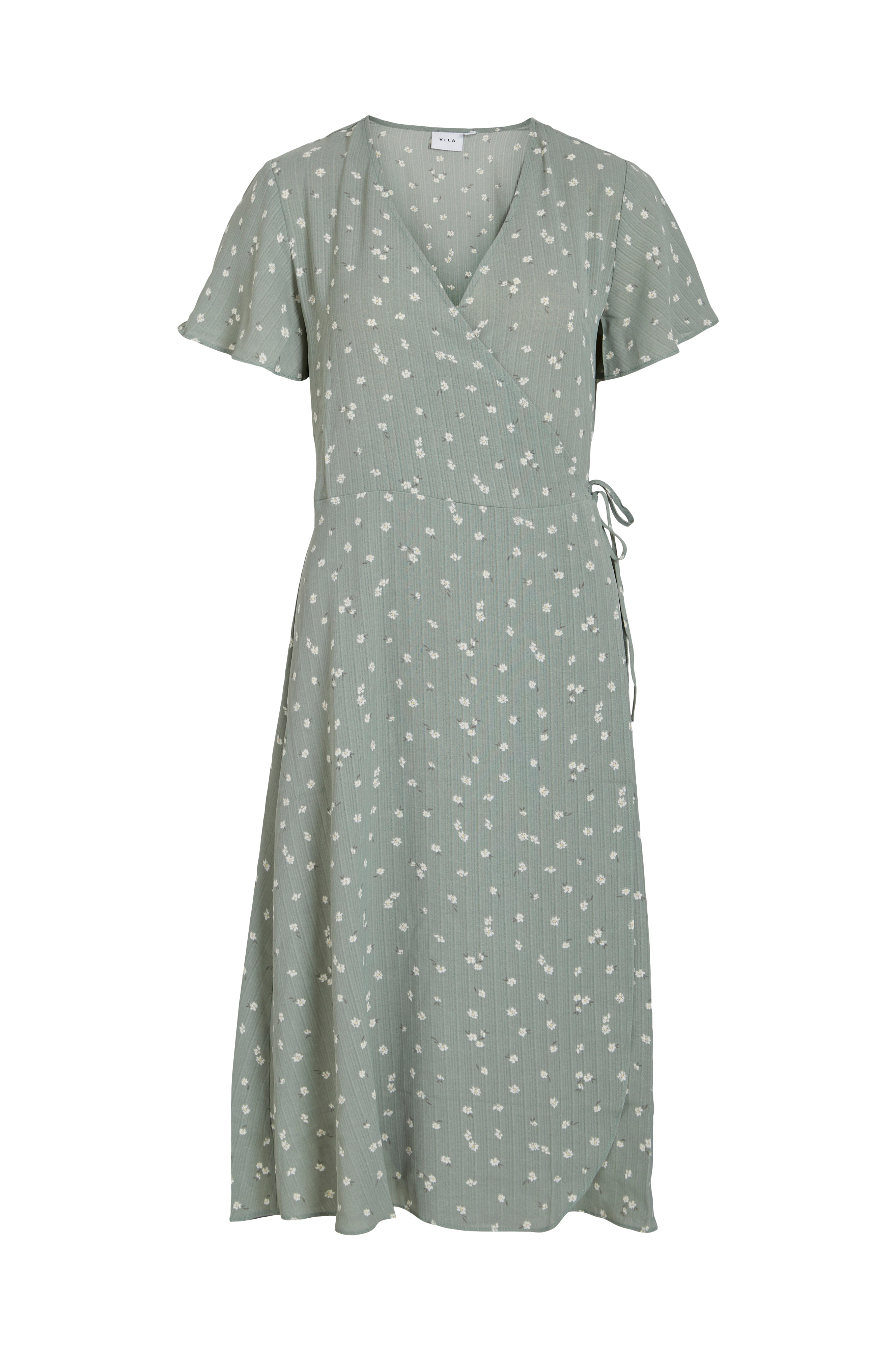 Öppen omlottmodell med avskärning runt om i midjan och smalt knytskärp samt kort, klockad ärm. Längd ca 114 cm i stl 36.