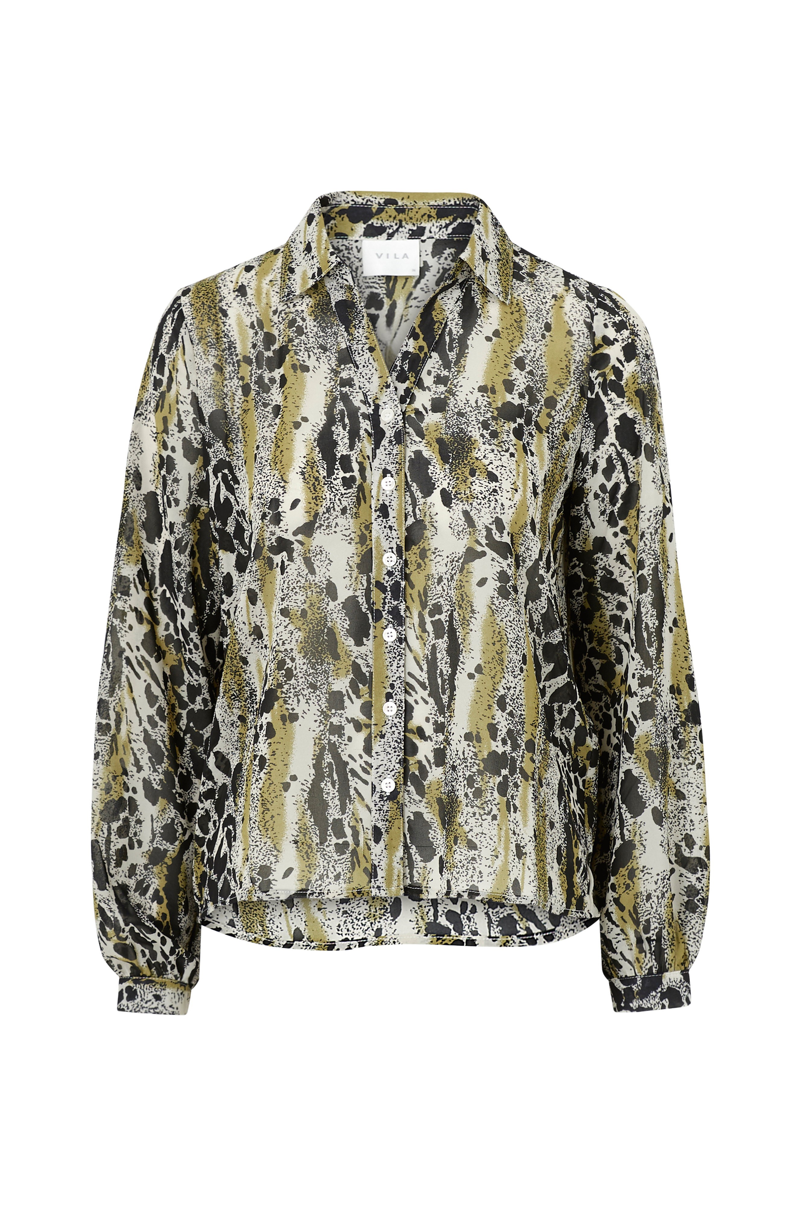 Rak modell med ledig form i vävd chiffong. Liten krage och v-ringning fram samt knappar hela vägen ner. Lång ärm med smal manschett i ärmslut.
