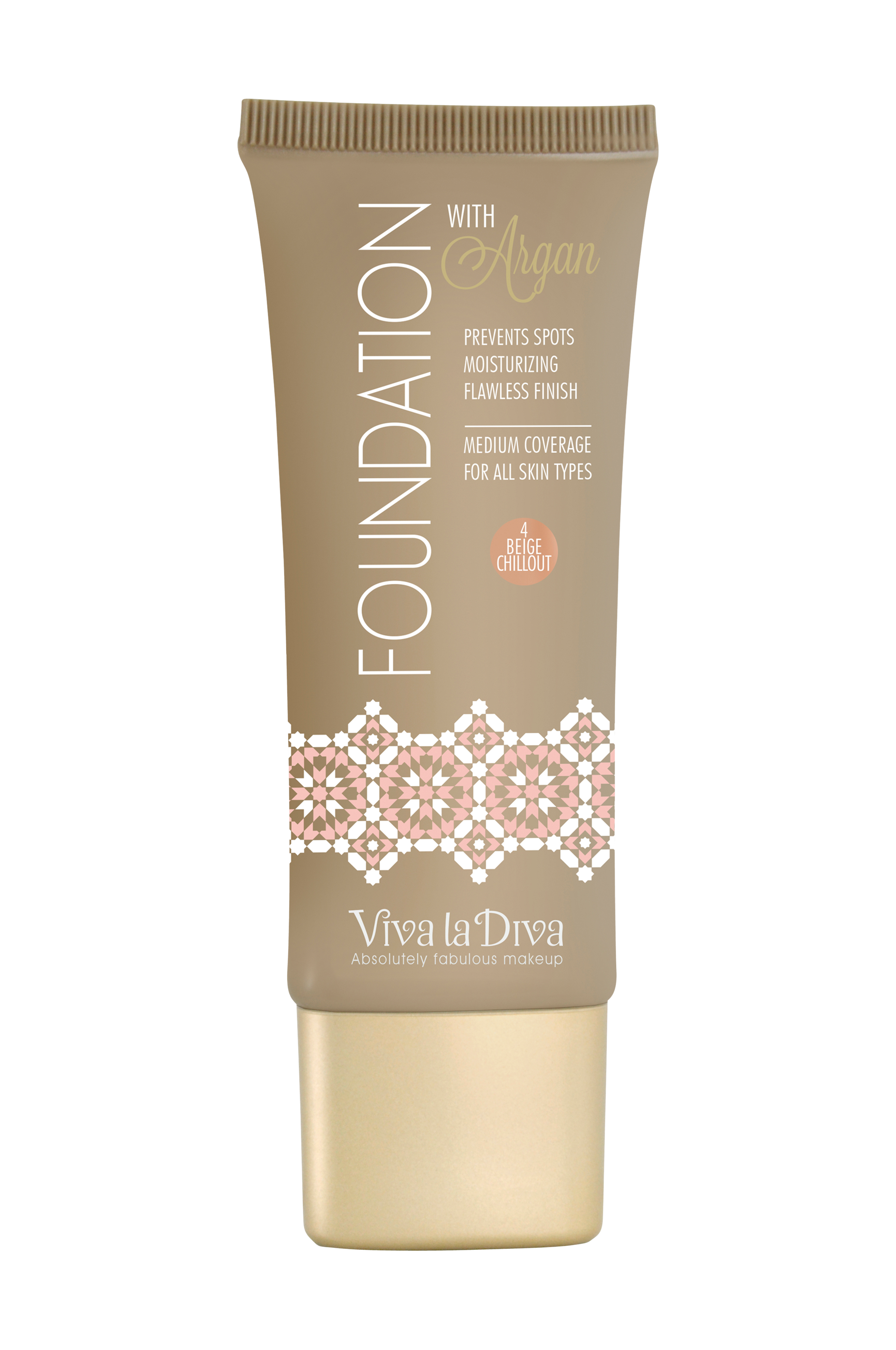 Viva la Diva Argan Foundation är en mediumtäckande lättapplicerad foundation som ger en naturlig look. Passar alla hudtyper och till dig som är mån om din hy då den både motverkar uttorkning av huden, förebygger rynkor och ger näring samt motverkar kvisslor tack vare Argan oils egenskaper.