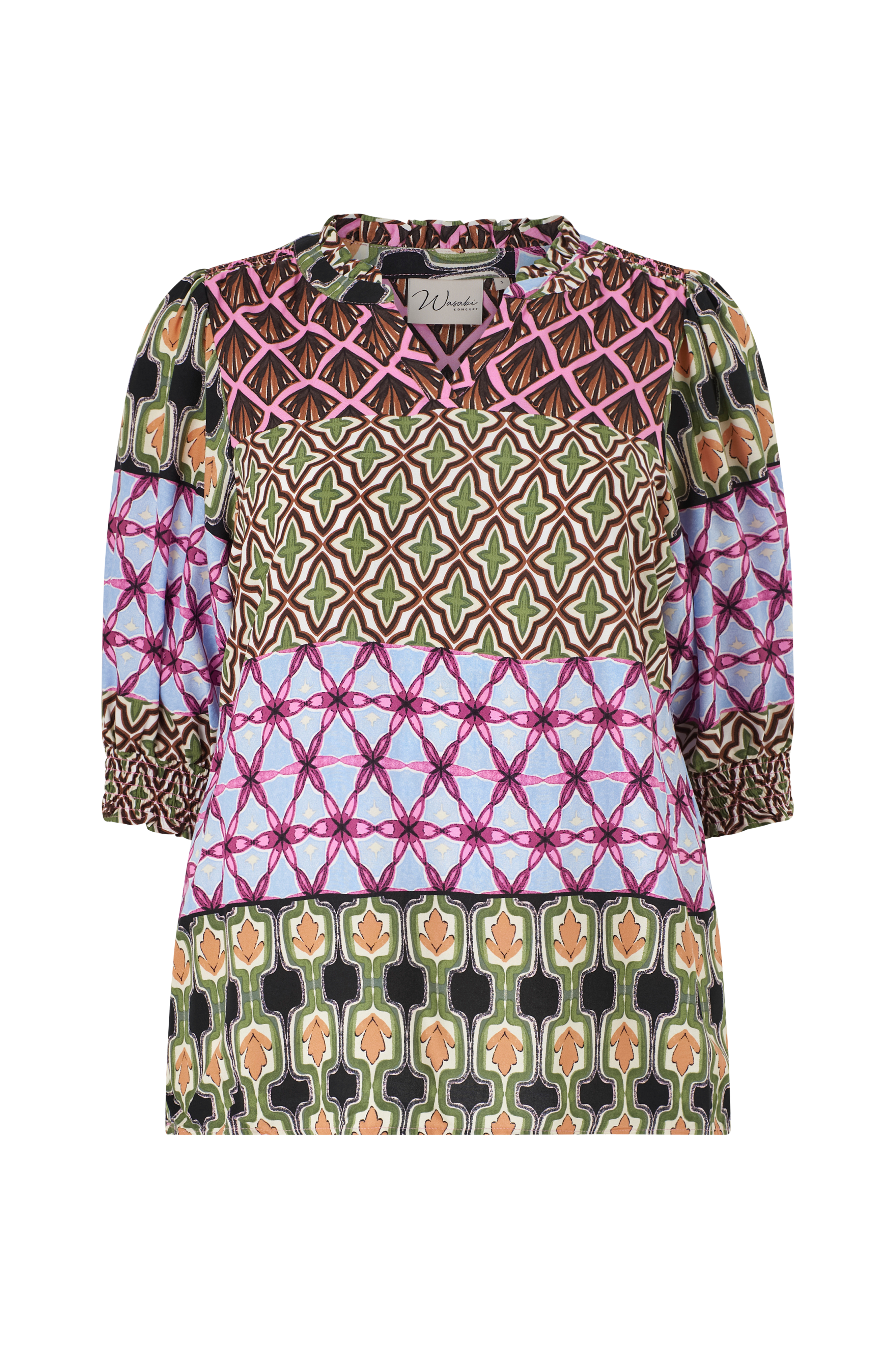 • Mönstrad blus i viskos• Rund hals med volang och v-ringning fram• Halvlånga ärmar med resår i ärmsluten• Plusstorlekar