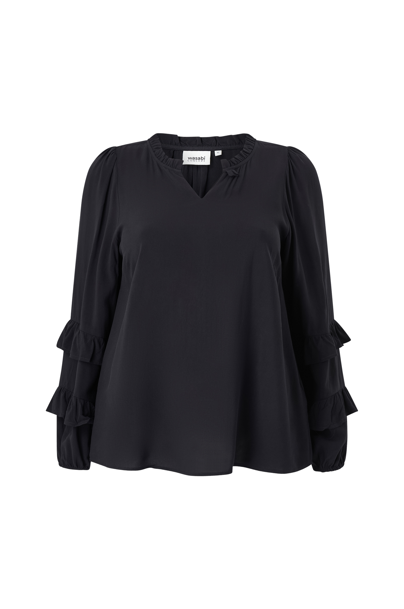 • Långa, vida ärmar med volanger och resår i ärmsluten