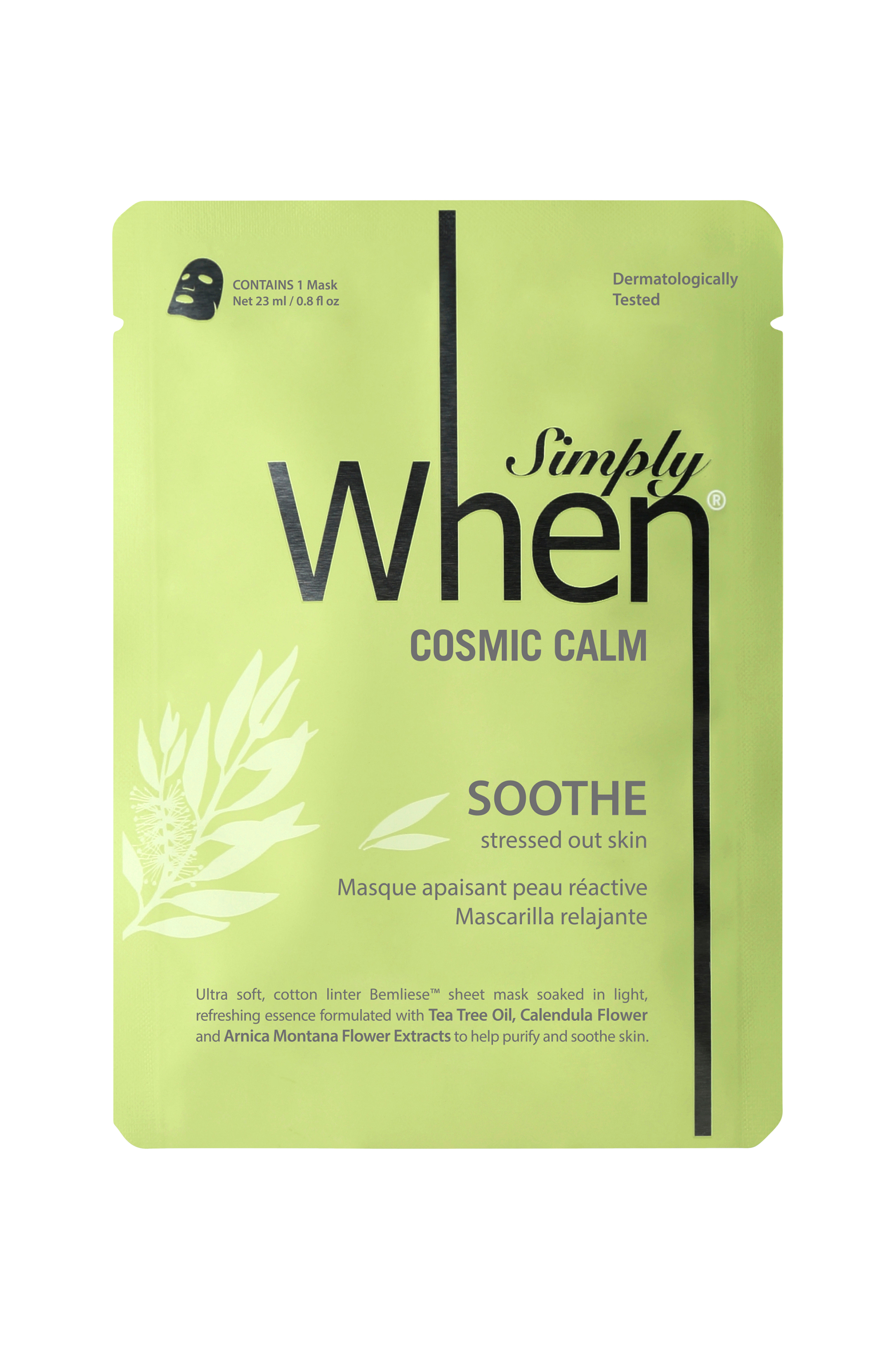 Simply When Cosmic Calm - en ultramjuk arkmask doppad i en lätt, uppfriskande formula av tea tree-olja, ringblomsexktrakt och arnica montana flower-extrakt (hästfibbla) som renar och lugnar hyn. Simply When® använder ett ultramjukt, biologiskt nedbrytbart och miljövänligt ark av 100% bomull (Bemliese™). Lämplig för alla hudtyper.