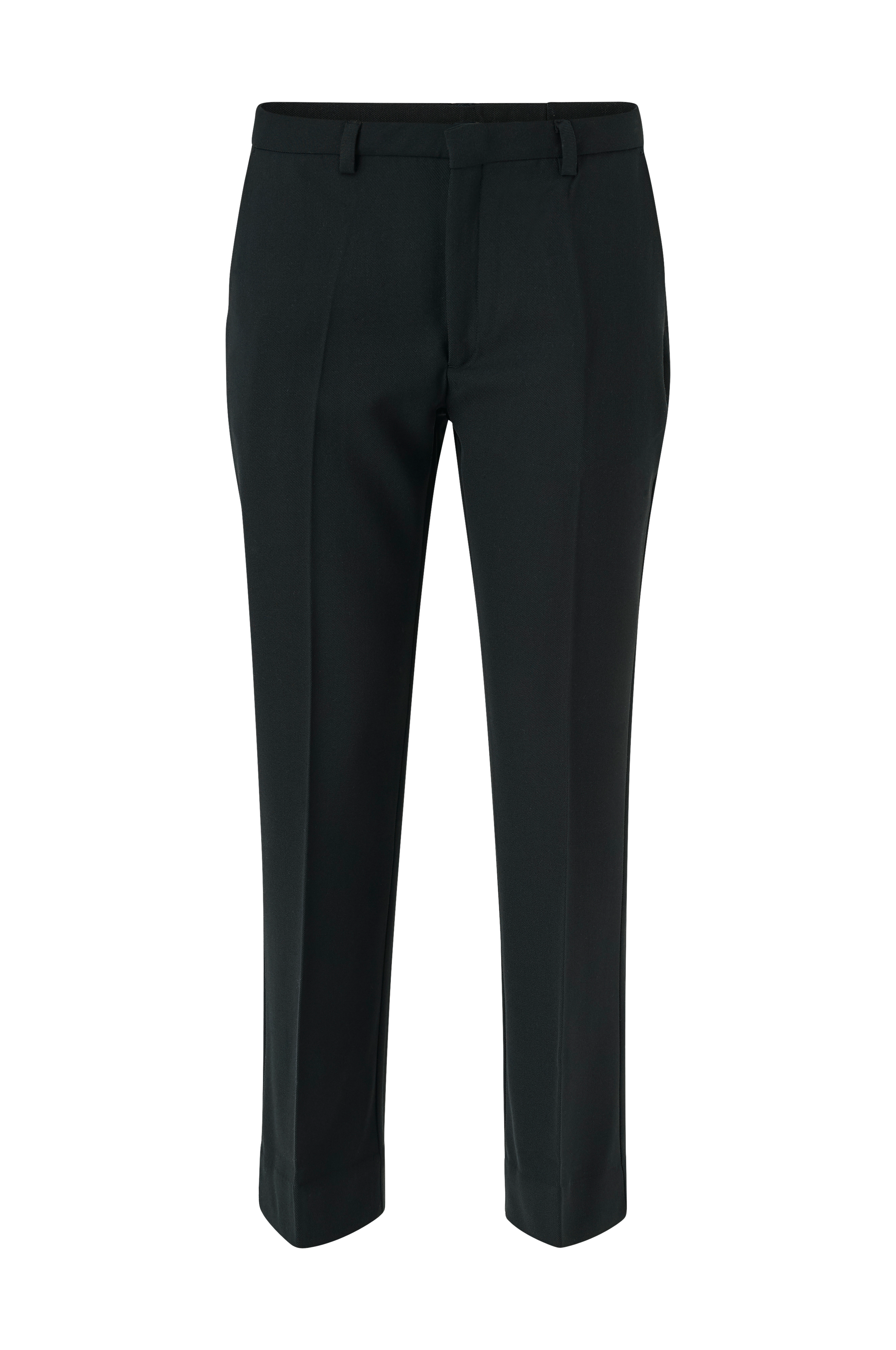 Byxor Carnot från Whyred i ankellång kostymmodell i fin ullmix med pressveck och fickor både i sidorna och bak. Hysk- och hakförslutning i midjan, dragkedjegylf samt hällor i midjan. Beninnerlängd ca 66 cm i stl 36.