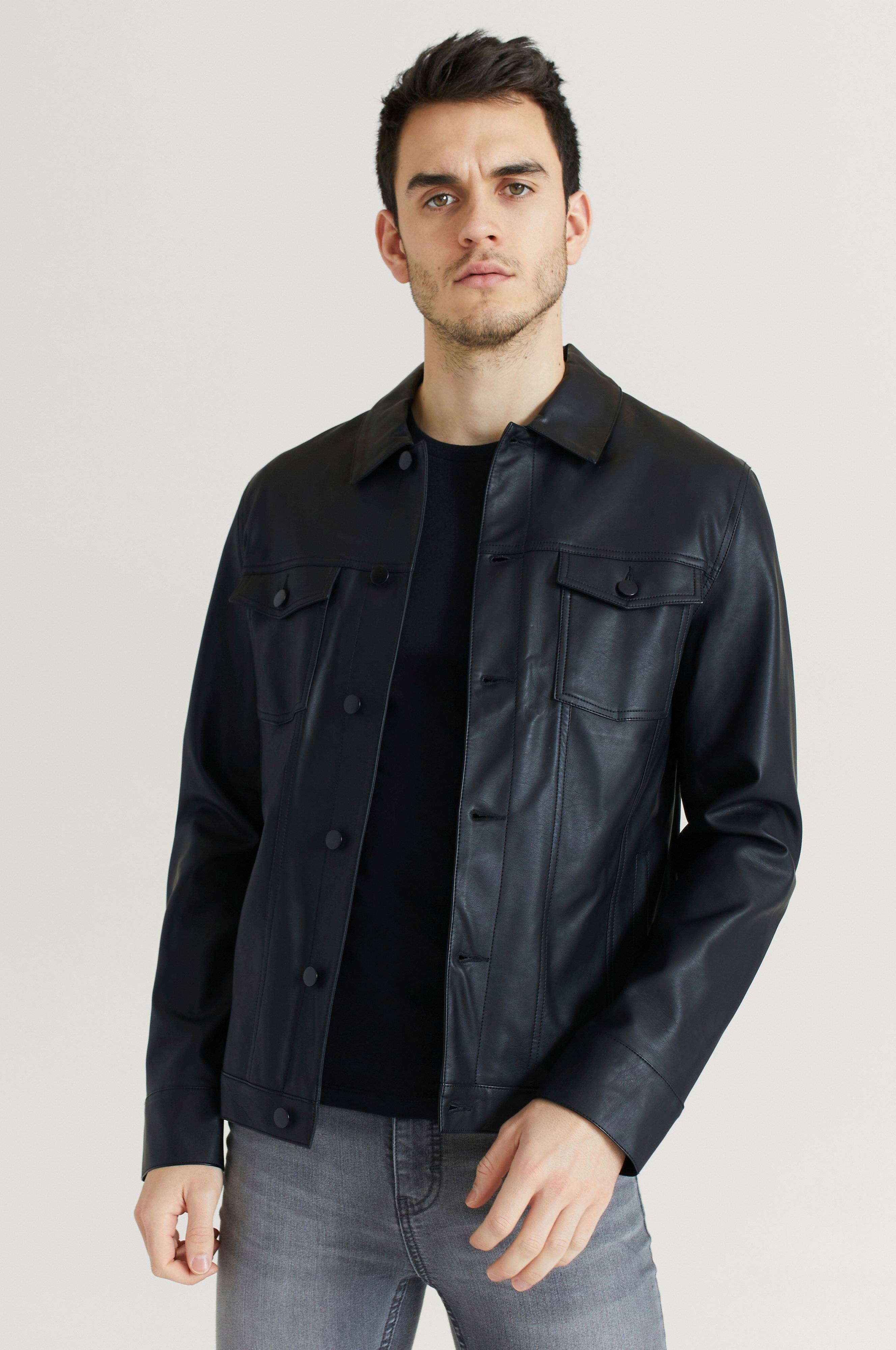 Jacka Trucker Jacket Fake Leather från William Baxter. Jackan har normal passform och är tillverkad i skinnimitation. Insidan är fodrad med ett tunt tyg. Truckermodell med krage och knappar framtill. Jackan har två bröstfickor med ficklock och två sidofickor. Det sitter även en knapp vid varje ärmslut.