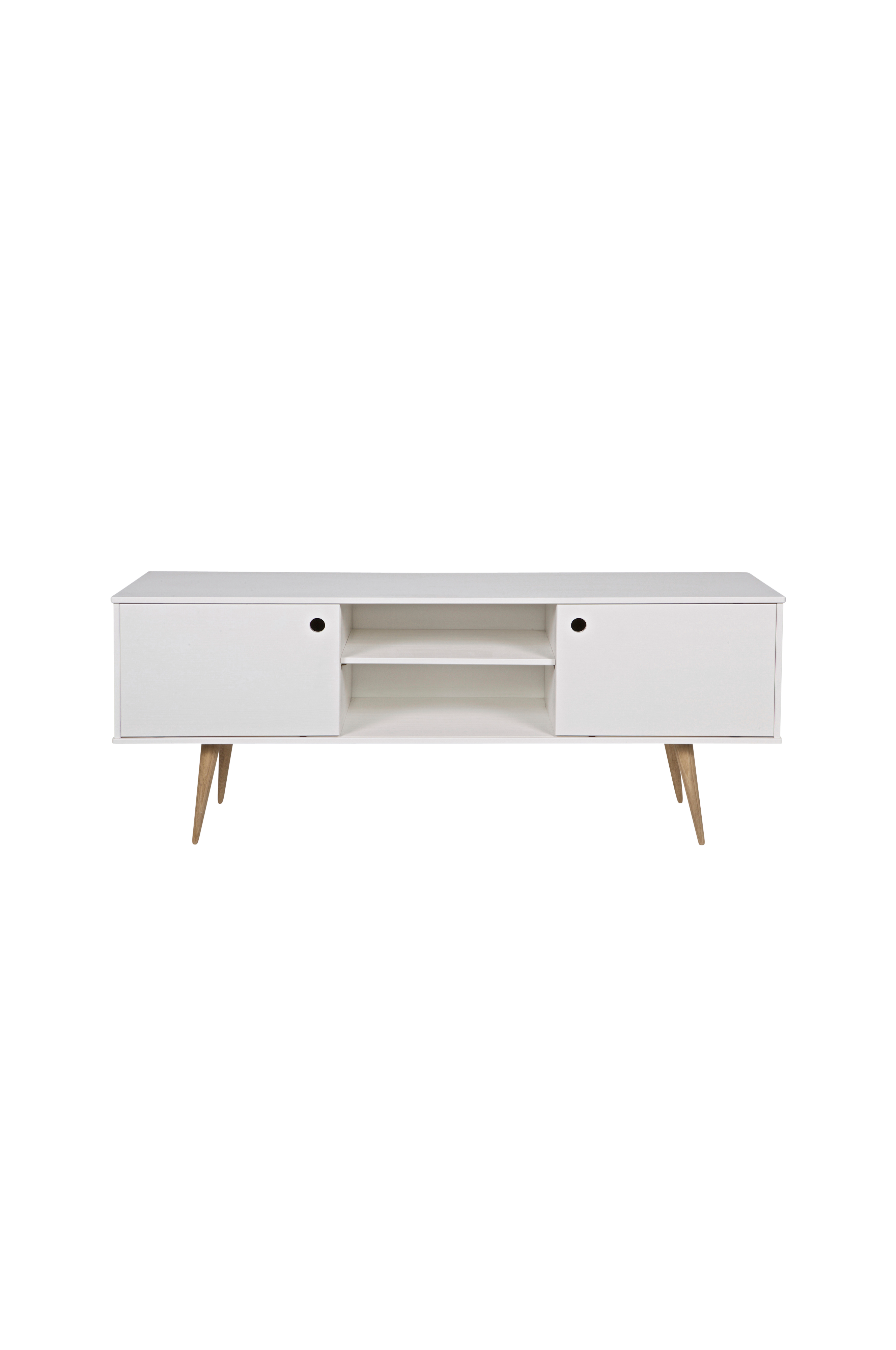 Mediabänk med måtten 60x150x38 cm är en Limited Edition och har ett modernt utseende. Skänken är tillverkad i lackerad FSC-furu och står på obehandlade FSC-klara ekben av trä. Innehåll: två skjutdörrar där t.ex. ljudutrustning kan placeras. Denna möbel levereras i separata delar och är enkel att montera med hjälp av den medföljande monteringsanvisningen.