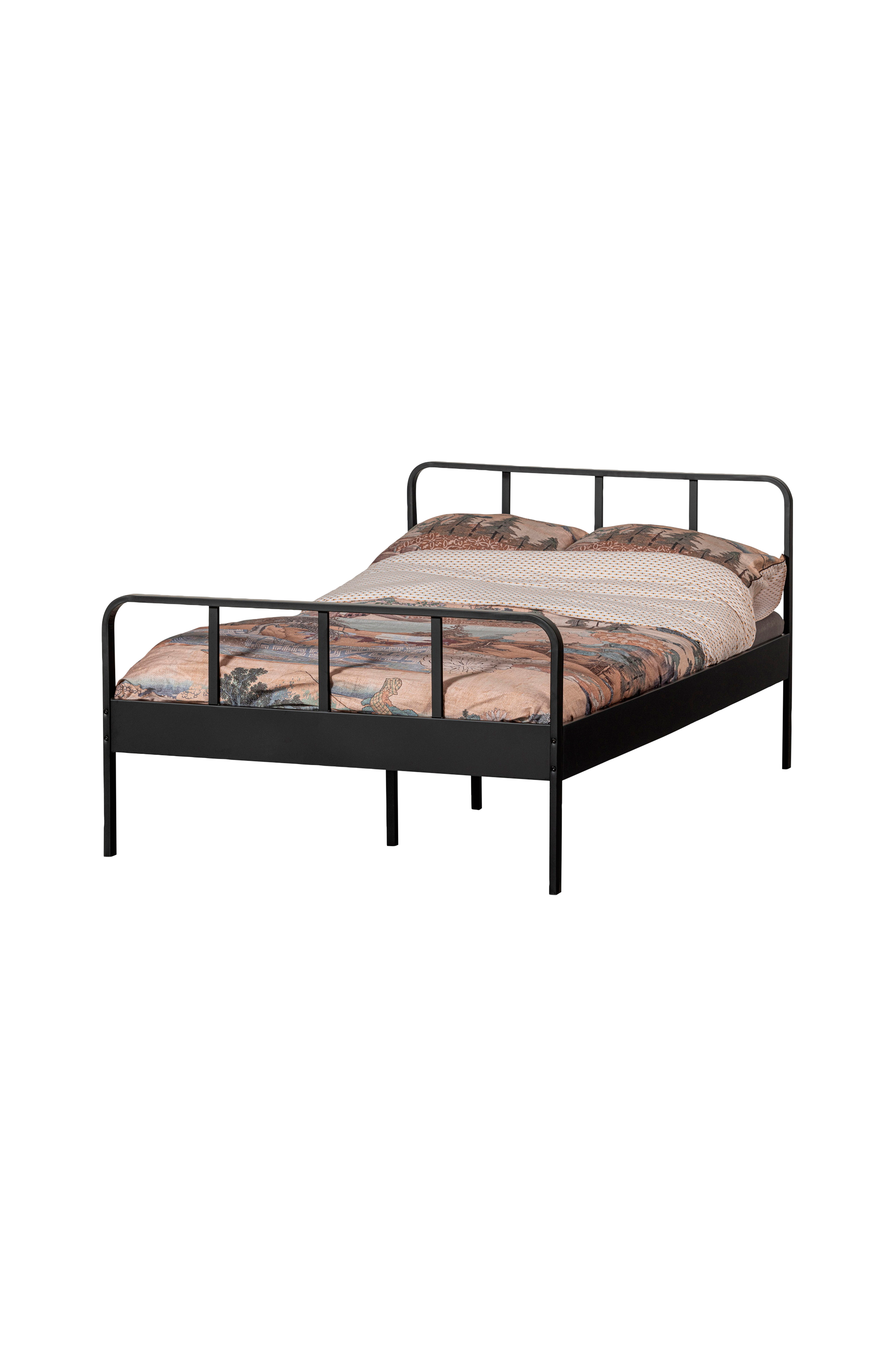 mees-sängen, från woood-kollektionen, kännetecknas av sin luftiga stångram och mattsvarta finish. Sängen är tillverkad av pulverlackerad metall och har en mycket stark konstruktion. Metallbädden rymmer en madrassstorlek på 120x200 cm. Från bottenplatta till sängkant är sängen 14 cm hög.