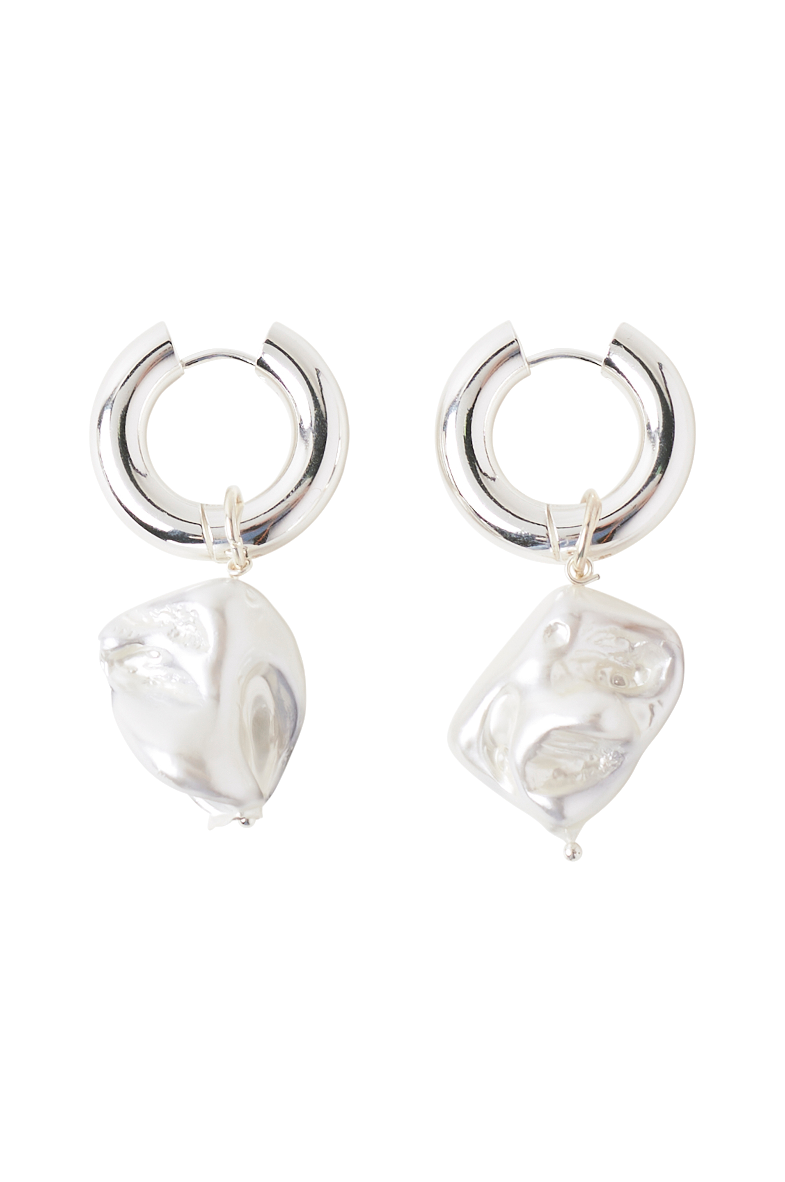Örhängen utformade med en pärla som sitter fast på en tjockare creol i silver. Tillverkade av silverpläterad stål. Nickeltestade. Bredd: ca 2 cm. Längd: ca 4 cm.