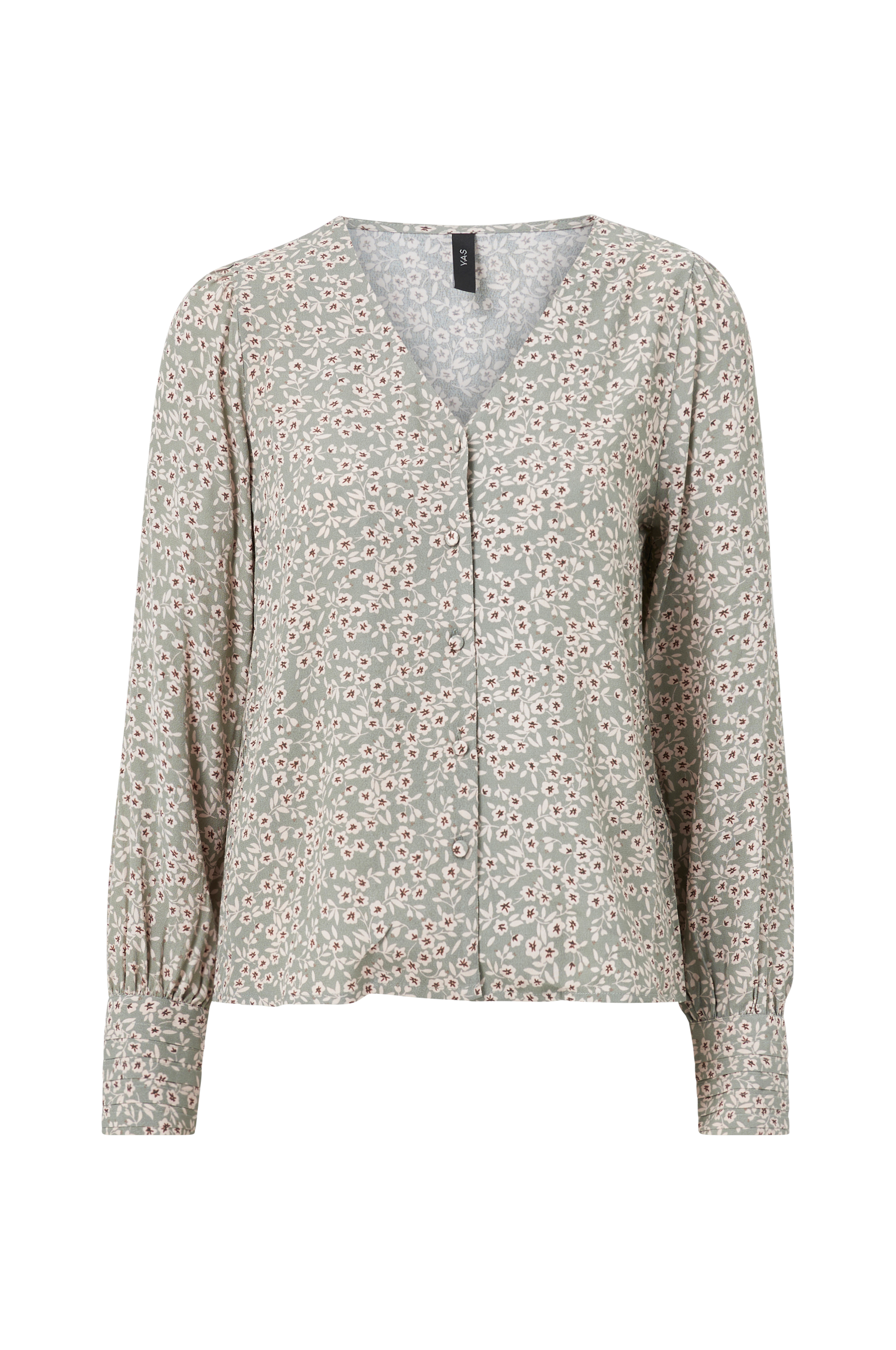 Rak modell med v-ringad hals och knäppning med klädda knappar fram. Lång, vid puffärm med rynk vid axeln och bred manschett med lagda veck i ärmslut.