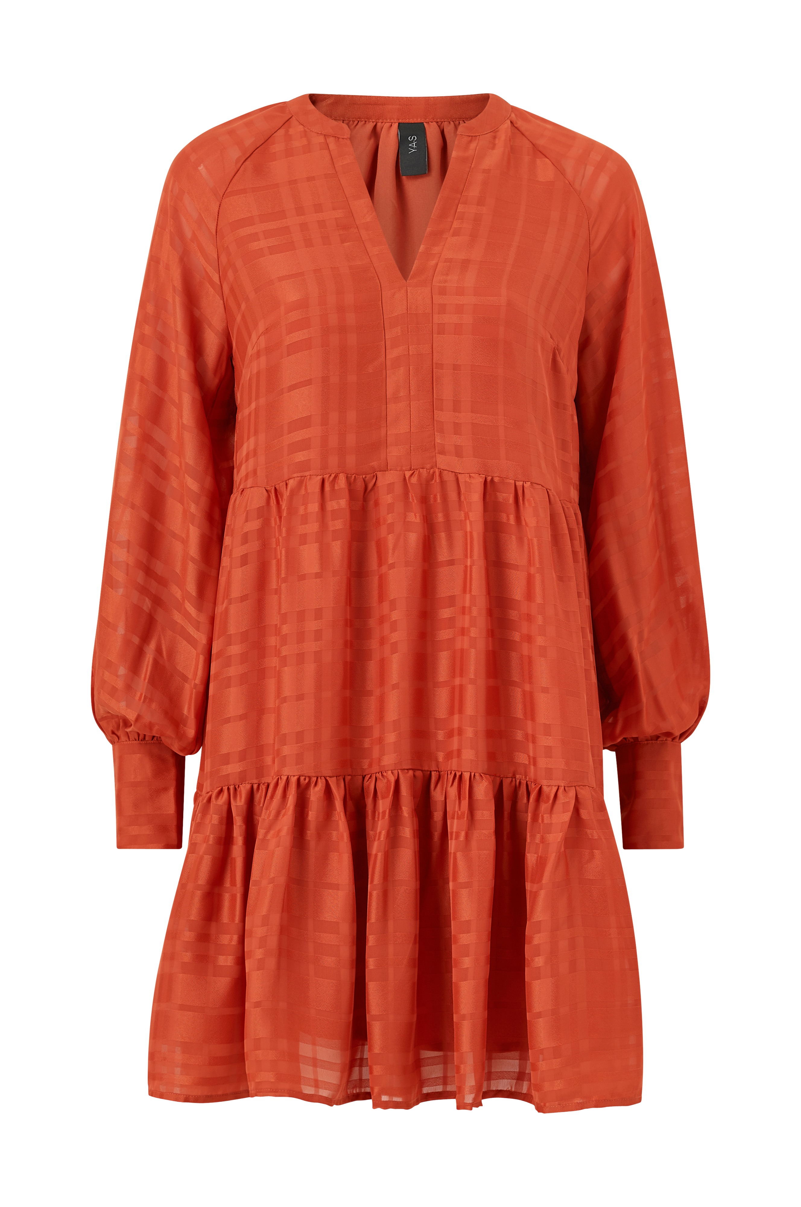 Klänning Heather LS Dress från Y.A.S. Lätt figurformad modell med avskärning i midjan och vidd i kjolen med påsydd volang i nederkanten. Liten kant i halsen med sprund mitt fram och lång ärm med bred manschett i ärmslut. Fin satin med vävda strukturränder och vävt foder. Längd ca 91 cm i stl S.