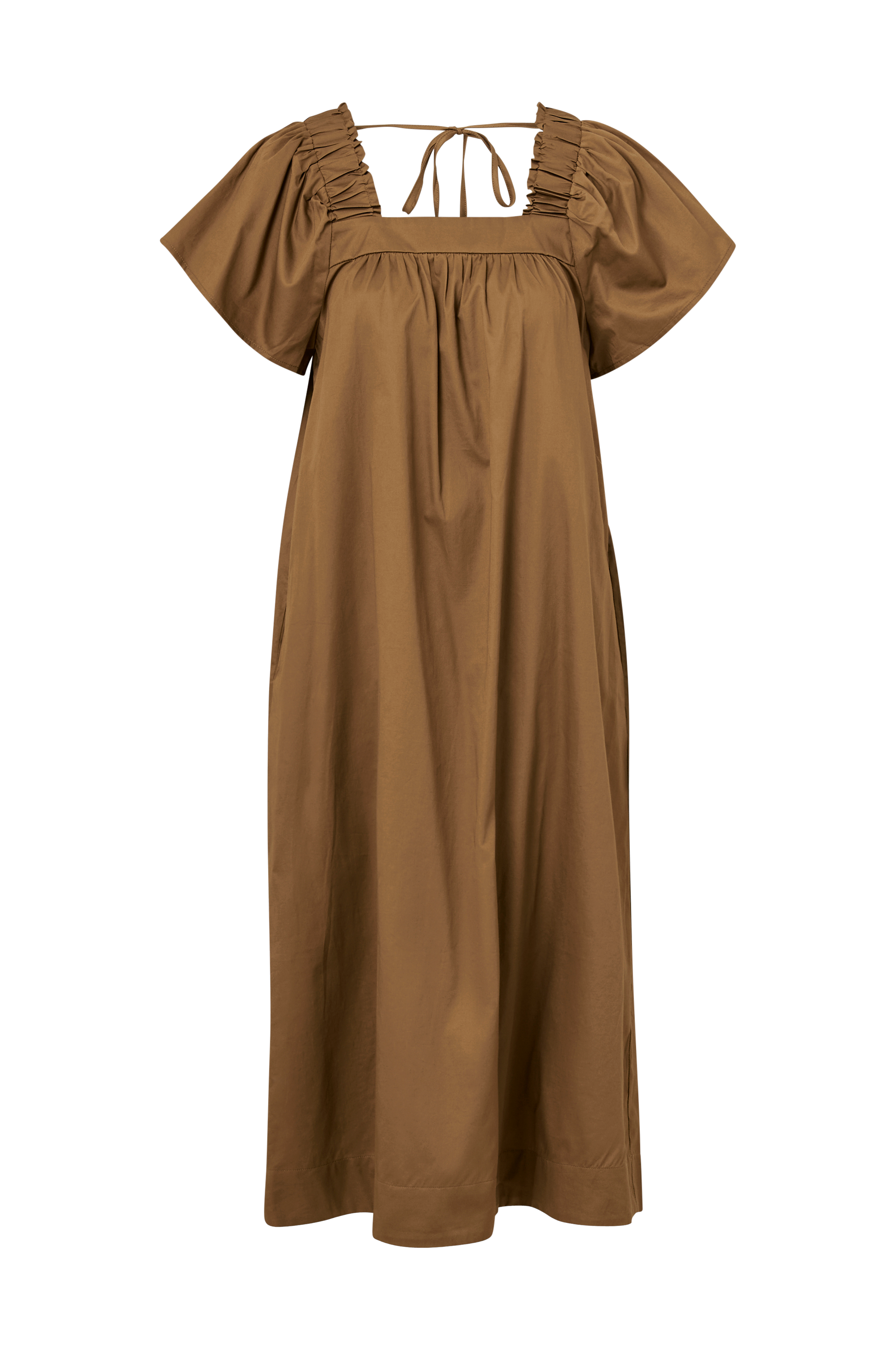 • Midiklänning• A-linjeform• Fyrkantig halsringning• Korta fjärilsärmar• Fickor i sidorna• Resår på axlarna• Knytband i nacken• Längd: 117 cm i storlek S