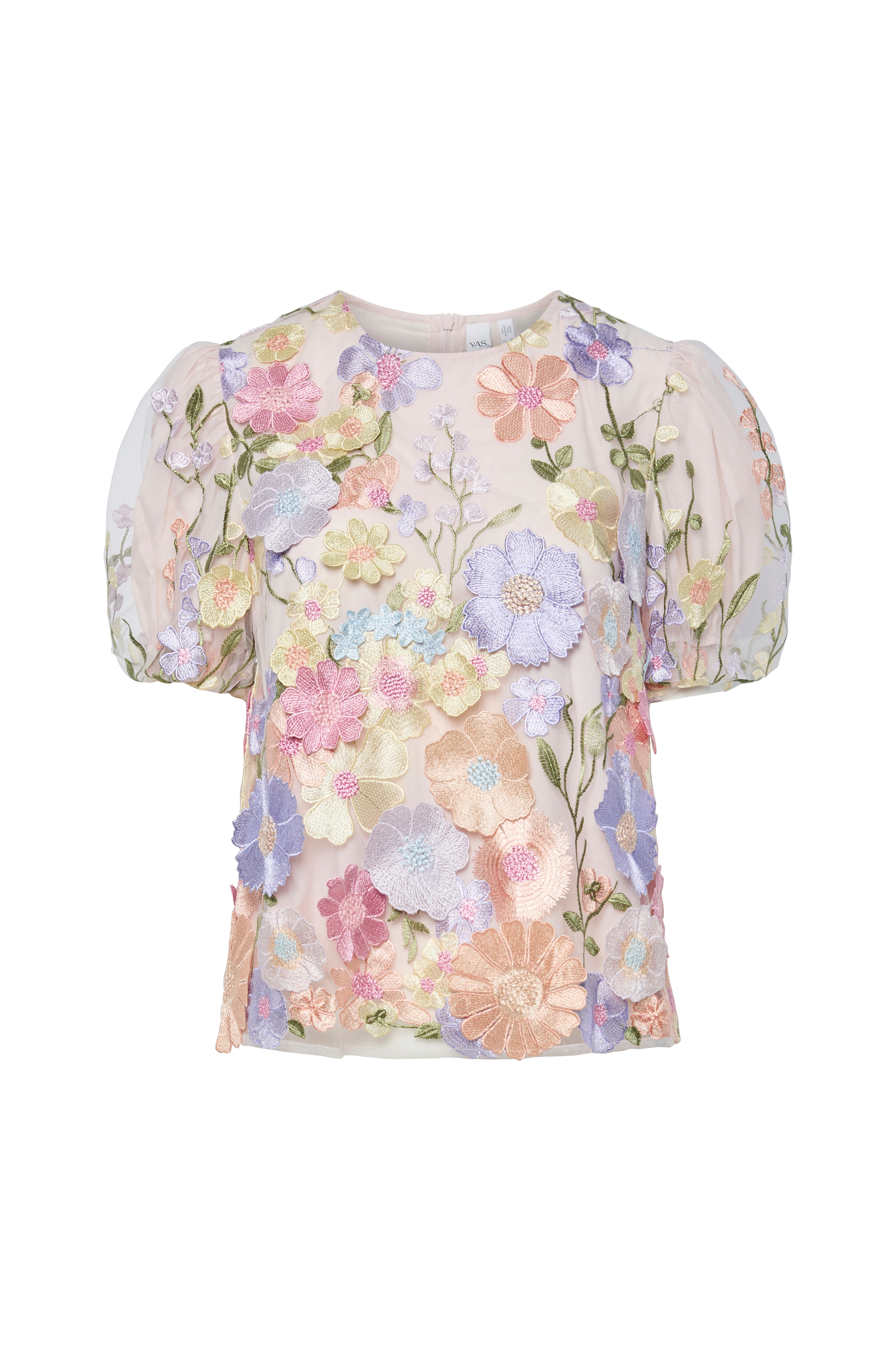 • Fodrad blus i transparent mesh med 3D-blommor• Broderade blommor• Rund hals• Dragkedja bak• Korta ärmar med resår i ärmsluten• Vävt foder