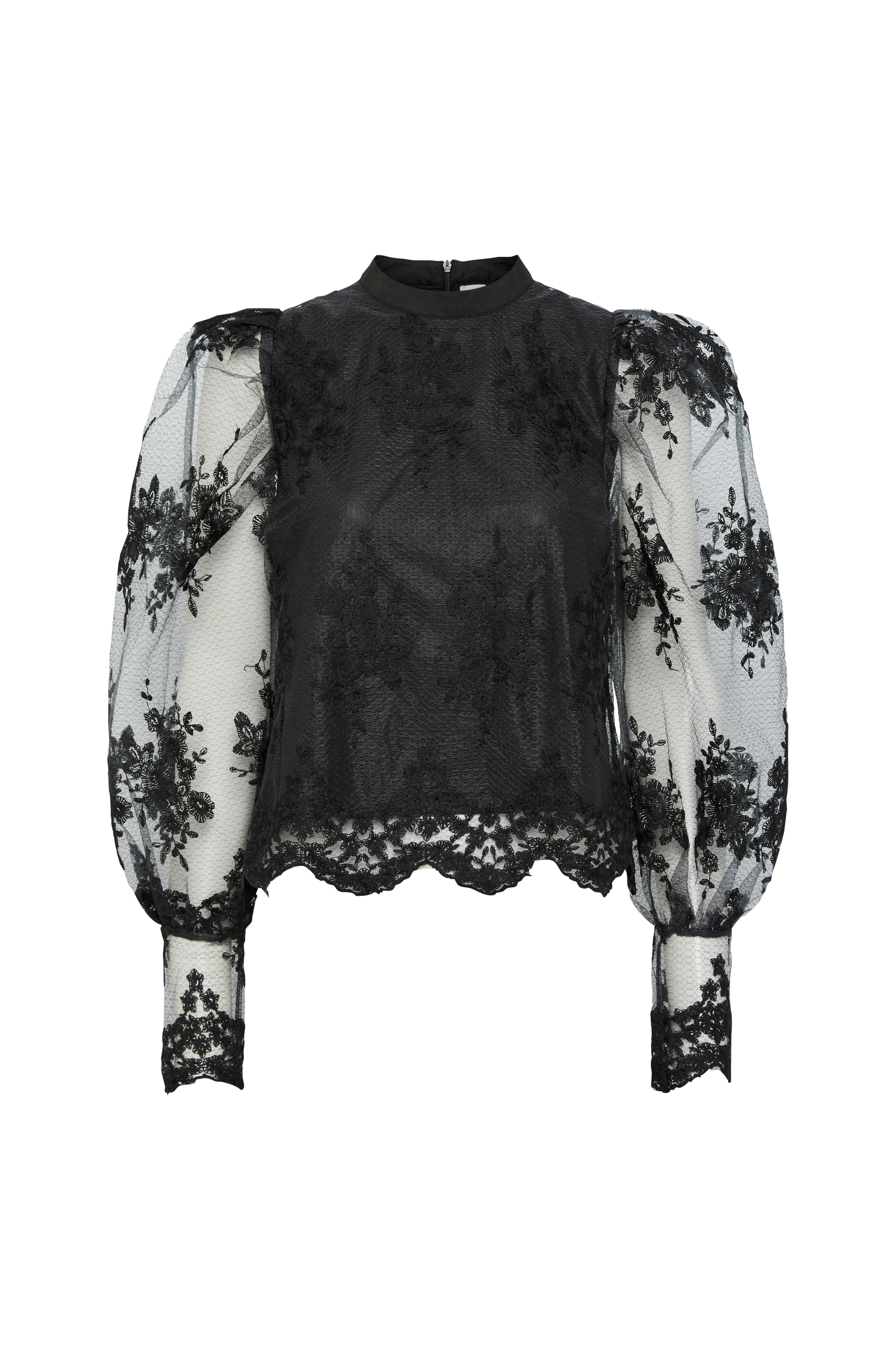 • Fodrad blus i spetsliknande, blommig mesh• Långa, ballongformade, transparenta armar med manschett• Rundad, halvhög hals• Vågig nederkant• Halvlång dragkedja i ryggen