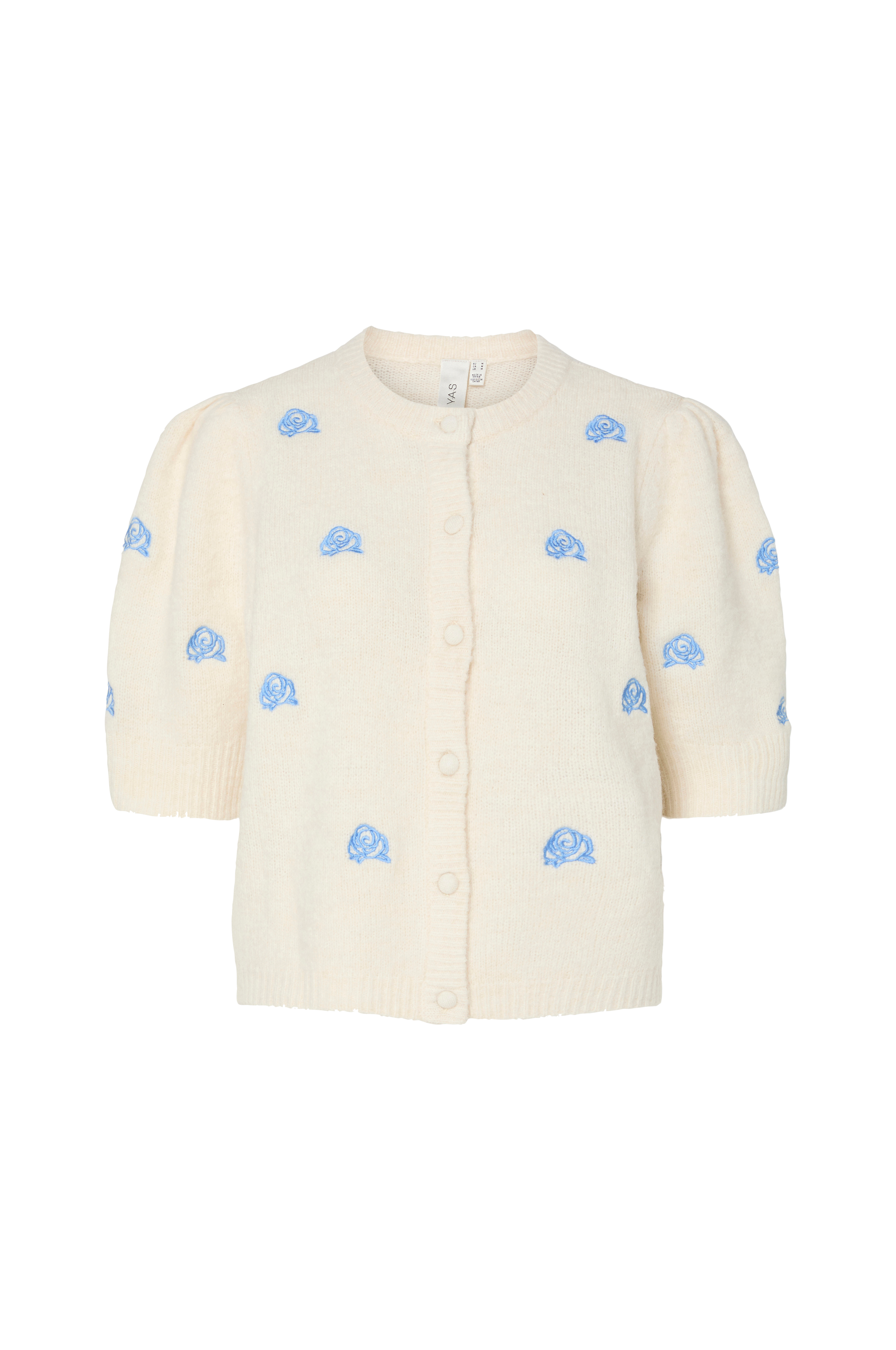 • Stickad cardigan i ullblandning• Broderade blommor runt om• Rund halsringning• Klädda knappar• Halvlånga ärmar• Ribbstickning i ärmsluten och nedtill