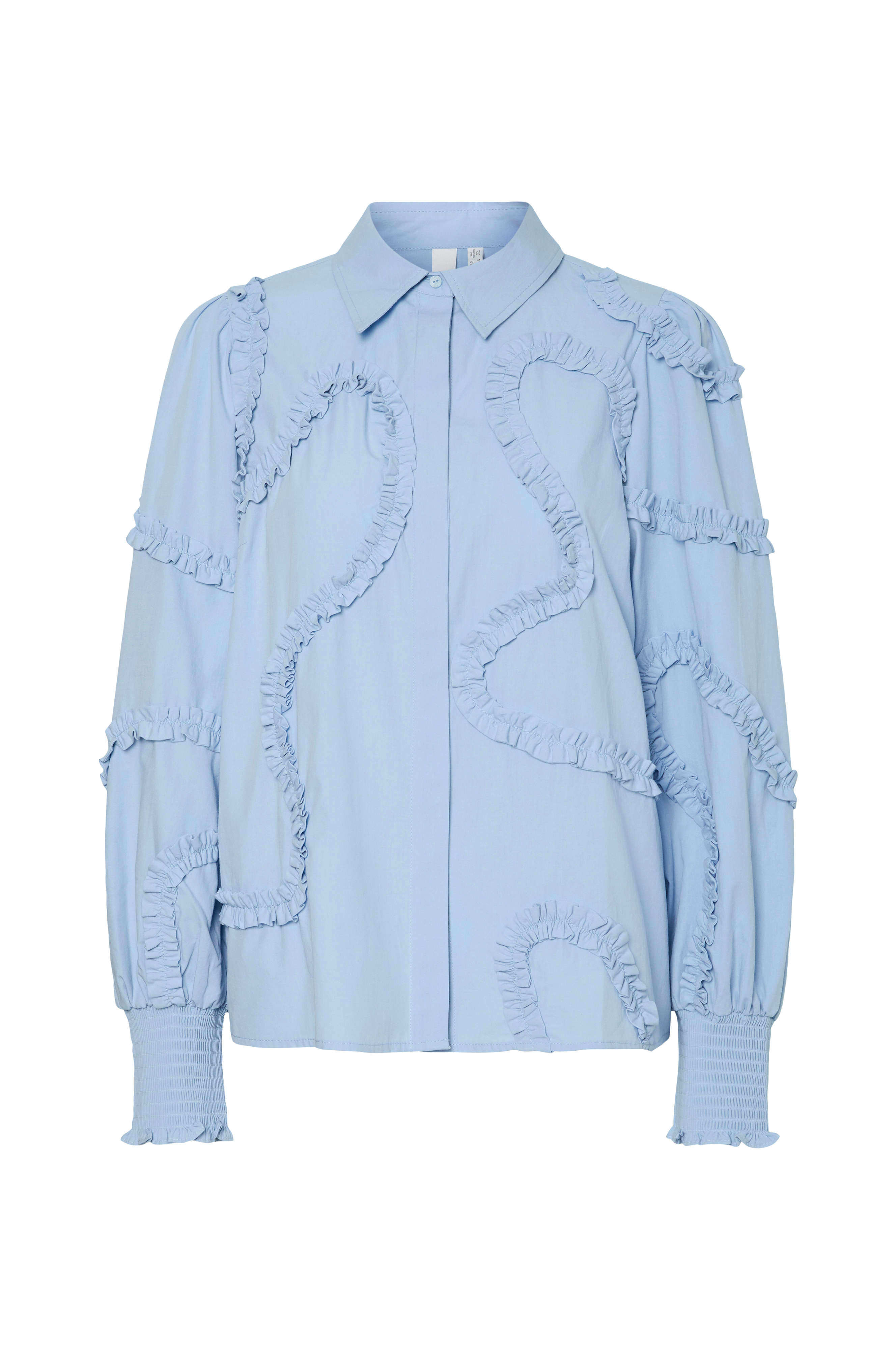 • Rak modell• Påsydda applikationer över hela• Liten krage• Dolda knappar fram• Vid, lång puffärm med smock i ärmsluten