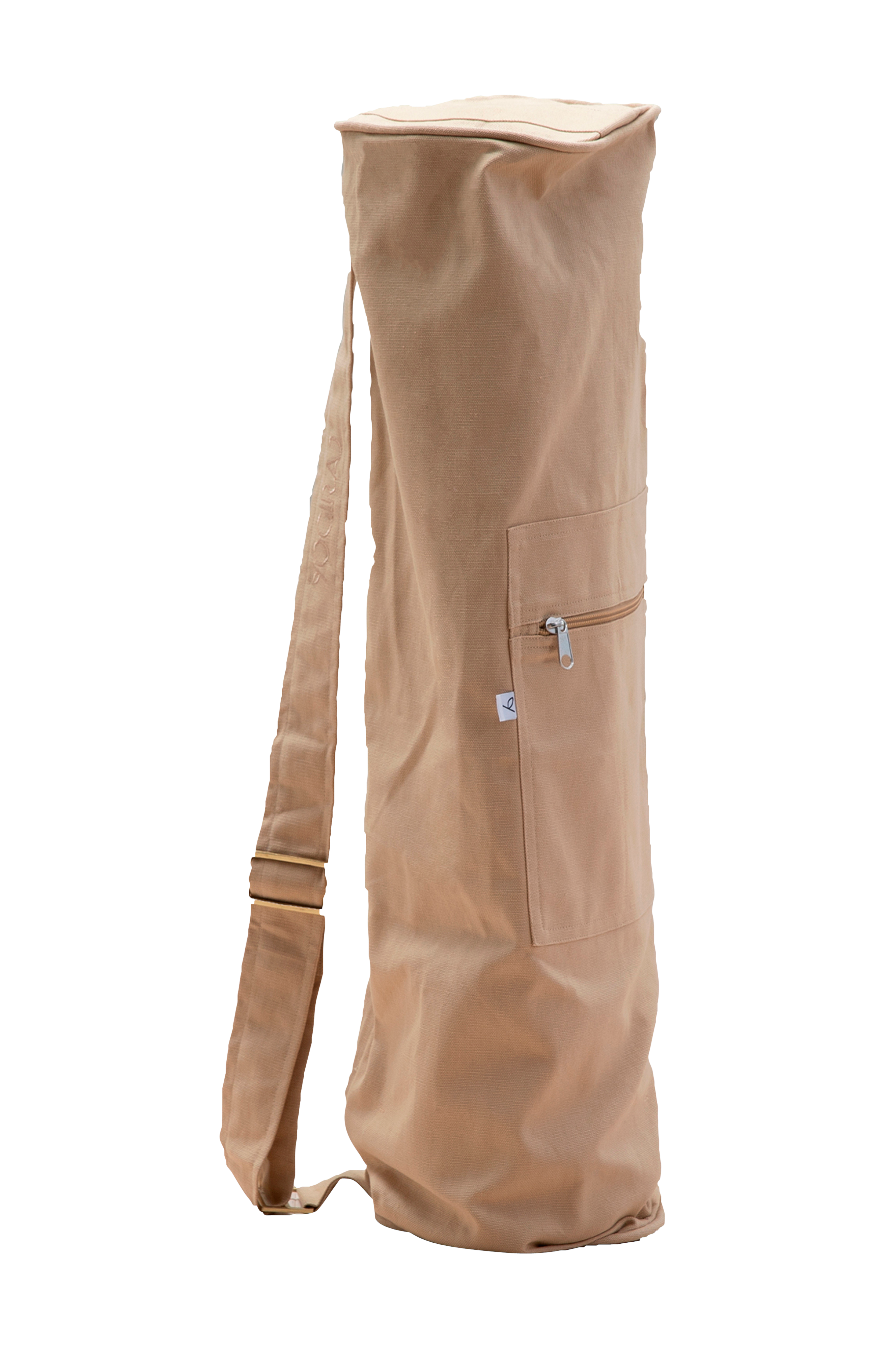En väska är tillverkad av 100% av organiskt bomull, framtaget enligt den internationella standarden Global Organic Textile Standard (GOTS). Den har dragkedja längs med hela väskan som gör det lätt att ta mattan ut och in ur väskan. Väskan har också ficka som du kan förvara mindre föremål i. Du kan bära väskan slängd över axeln med hjälp av den justerbara remmen så att den stannar på plats.