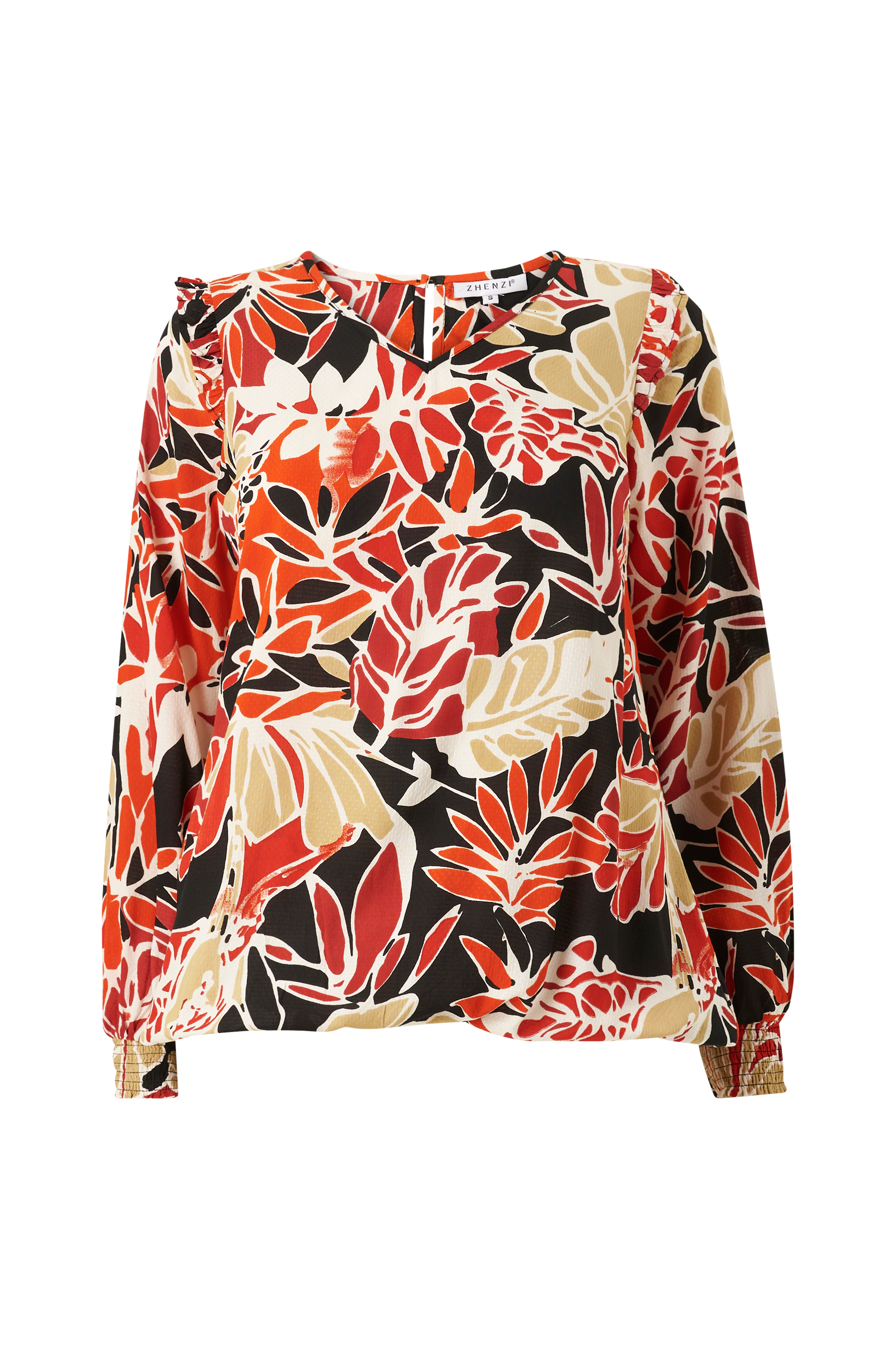 • Mönstrad blus i viskos• V-ringning• Volanger på axlarna• Sprund med knapp i nacken• Elastisk smock i ärmsluten• Elastisk nederkant• Plusstorlekar